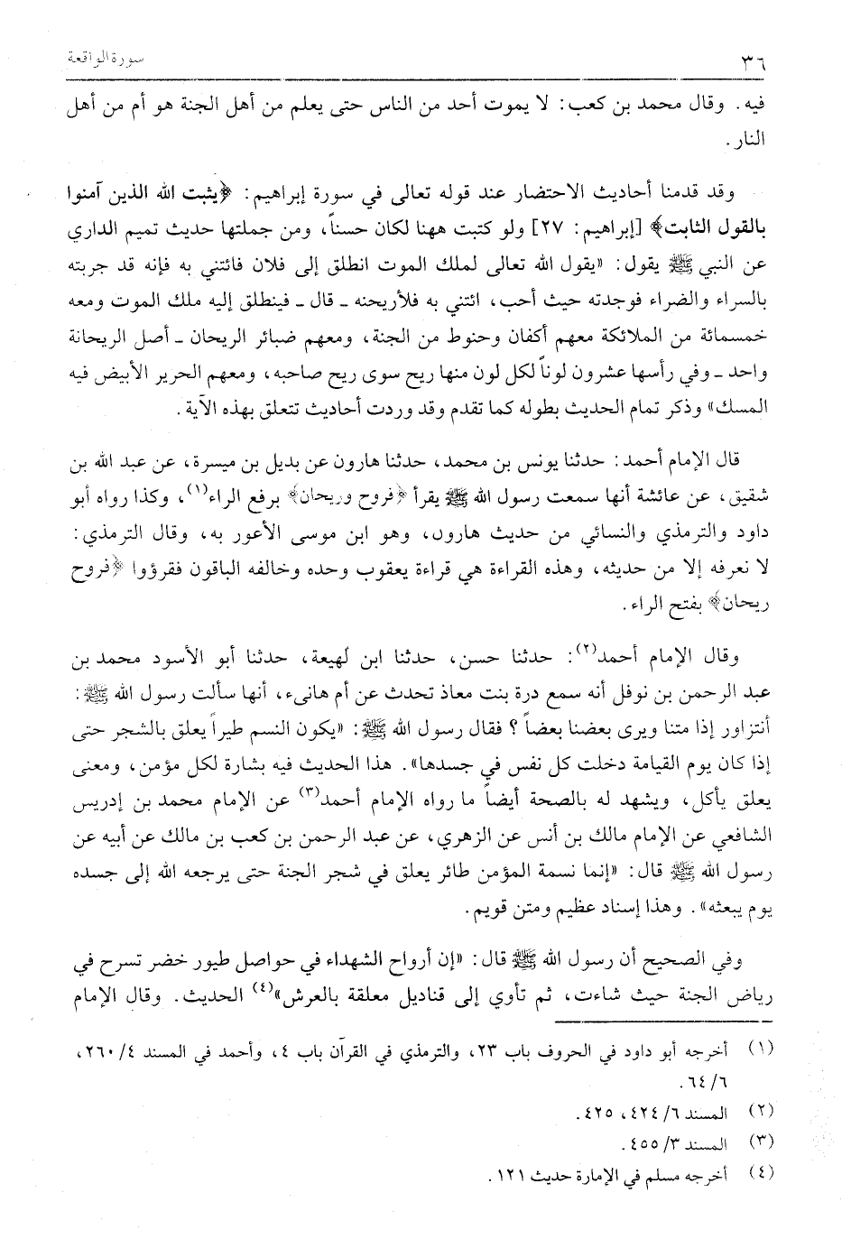 أَنَتَزَاوَرُ إِذَا مُتْنَا وَيَرَى بَعْضُنَا بَعْضًا؟ فَقَالَ رَسُولُ اللَّهِ صَلَّى اللَّهُ عَلَيْهِ وَسَلَّمَ: «يكون النَّسَمُ طَيْرًا يَعْلُقُ بِالشَّجَرِ حَتَّى إِذَا كَانَ يَوْمَ الْقِيَامَةِ دَخَلَتْ كُلُّ نَفْسٍ فِي جَسَدِهَا» . هَذَا الْحَدِيثُ فِيهِ بِشَارَةٌ لِكُلِّ مُؤْمِنٍ، وَمَعْنَى يَعْلُقُ يَأْكُلُ، وَيَشْهَدُ لَهُ بِالصِّحَّةِ أَيْضًا مَا رَوَاهُ الْإِمَامُ أَحْمَدُ «3» عَنِ الْإِمَامِ مُحَمَّدِ بْنِ إِدْرِيسَ الشَّافِعِيِّ عَنِ الْإِمَامِ مَالِكِ بْنِ أَنَسٍ عَنِ الزُّهْرِيِّ، عَنْ عَبْدِ الرَّحْمَنِ بْنِ كَعْبِ بْنِ مَالِكٍ عَنْ أَبِيهِ عَنْ رَسُولِ اللَّهِ صَلَّى اللَّهُ عَلَيْهِ وَسَلَّمَ قَالَ: «إِنَّمَا نَسَمَةُ الْمُؤْمِنِ طَائِرٌ يَعْلُقُ فِي شَجِرِ الْجَنَّةِ حَتَّى يُرْجِعَهُ اللَّهُ إِلَى جَسَدِهِ يَوْمَ يَبْعَثُهُ» . وَهَذَا إِسْنَادٌ عَظِيمٌ وَمَتْنٌ قَوِيمٌ.