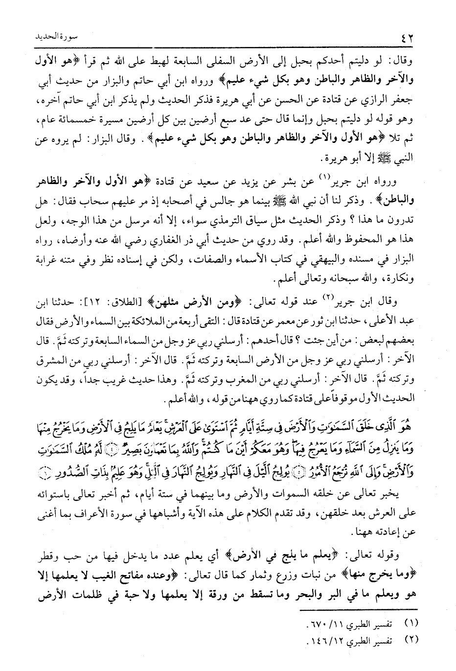وَقَالَ: لَوْ دَلَّيْتُمْ أَحَدَكُمْ بِحَبْلٍ إِلَى الْأَرْضِ السُّفْلَى السَّابِعَةِ لَهَبَطَ عَلَى اللَّهِ ثُمَّ قَرَأَ هُوَ الْأَوَّلُ وَالْآخِرُ وَالظَّاهِرُ وَالْباطِنُ وَهُوَ بِكُلِّ شَيْءٍ عَلِيمٌ ورواه ابن أَبِي حَاتِمٍ وَالْبَزَّارُ مِنْ حَدِيثِ أَبِي جَعْفَرٍ الرَّازِيِّ عَنْ قَتَادَةَ عَنِ الْحَسَنِ عَنْ أَبِي هُرَيْرَةَ فَذَكَرَ الْحَدِيثَ وَلَمْ يَذْكُرِ ابْنُ أَبِي حَاتِمٍ آخِرَهُ، وَهُوَ قَوْلُهُ لَوْ دَلَّيْتُمْ بِحَبْلٍ وَإِنَّمَا قَالَ حَتَّى عَدَّ سَبْعَ أَرَضِينَ بَيْنَ كُلِّ أَرْضَيْنِ مَسِيرَةُ خَمْسِمِائَةِ عَامٍ، ثُمَّ تَلَا هُوَ الْأَوَّلُ وَالْآخِرُ وَالظَّاهِرُ وَالْباطِنُ وَهُوَ بِكُلِّ شَيْءٍ عَلِيمٌ. وَقَالَ الْبَزَّارُ: لَمْ يَرْوِهِ عَنِ النَّبِيِّ صَلَّى اللَّهُ عَلَيْهِ وَسَلَّمَ إِلَّا أَبُو هُرَيْرَةَ.