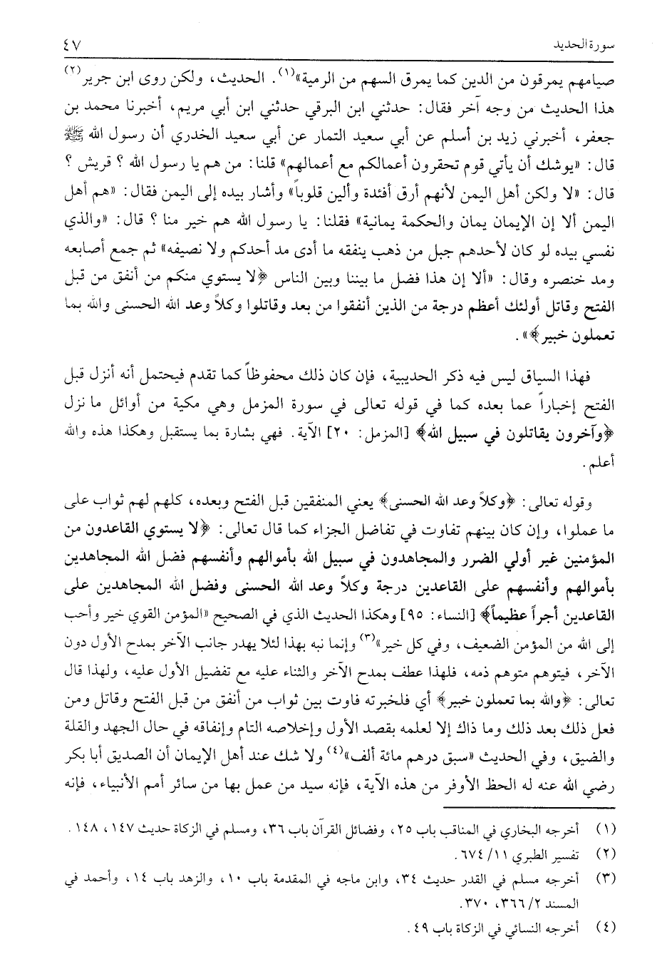 وقوله تعالى: وَكُلًّا وَعَدَ اللَّهُ الْحُسْنى يَعْنِي الْمُنْفِقِينَ قَبْلَ الْفَتْحِ وَبَعْدَهُ، كُلُّهُمْ لَهُمْ ثَوَابٌ عَلَى مَا عَمِلُوا، وَإِنْ كَانَ بَيْنَهُمْ تَفَاوُتٌ فِي تُفَاضُلِ الجزاء كما قال تعالى: لَا يَسْتَوِي الْقاعِدُونَ مِنَ الْمُؤْمِنِينَ غَيْرُ أُولِي الضَّرَرِ وَالْمُجاهِدُونَ فِي سَبِيلِ اللَّهِ بِأَمْوالِهِمْ وَأَنْفُسِهِمْ فَضَّلَ اللَّهُ الْمُجاهِدِينَ بِأَمْوالِهِمْ وَأَنْفُسِهِمْ عَلَى الْقاعِدِينَ دَرَجَةً وَكُلًّا وَعَدَ اللَّهُ الْحُسْنى وَفَضَّلَ اللَّهُ الْمُجاهِدِينَ عَلَى الْقاعِدِينَ أَجْراً عَظِيماً [النِّسَاءِ: 95] وَهَكَذَا الْحَدِيثُ الَّذِي فِي الصَّحِيحِ «الْمُؤْمِنُ الْقَوِيُّ خَيْرٌ وَأَحَبُّ إِلَى اللَّهِ مِنَ الْمُؤْمِنِ الضَّعِيفِ، وَفِي كُلٍّ خَيْرٌ» «3» وَإِنَّمَا نَبَّهَ بِهَذَا لِئَلَّا يُهْدَرَ جَانِبُ الْآخَرِ بِمَدْحِ الْأَوَّلِ دُونَ الْآخَرِ، فَيَتَوَهَّمُ مُتَوَهِّمٌ ذَمَّهُ، فَلِهَذَا عَطَفَ بِمَدْحِ الْآخَرِ وَالثَّنَاءِ عَلَيْهِ مَعَ تَفْضِيلِ الْأَوَّلِ عَلَيْهِ، وَلِهَذَا قَالَ تعالى: وَاللَّهُ بِما تَعْمَلُونَ خَبِيرٌ أَيْ فَلِخِبْرَتِهِ فَاوَتَ بَيْنَ ثَوَابِ مَنْ أَنْفَقَ مِنْ قَبْلِ الْفَتْحِ وَقَاتَلَ وَمَنْ فَعَلَ ذَلِكَ بَعْدَ ذَلِكَ وَمَا ذاك إِلَّا لِعِلْمِهِ بِقَصْدِ الْأَوَّلِ وَإِخْلَاصِهِ التَّامِّ وَإِنْفَاقِهِ فِي حَالِ الْجُهْدِ وَالْقِلَّةِ وَالضِّيقِ، وَفِي الْحَدِيثِ «سَبَقَ دِرْهَمٌ مِائَةَ أَلْفٍ» «4» وَلَا شَكَّ عِنْدَ أَهْلِ الْإِيمَانِ أَنَّ الصِّدِّيقَ أَبَا بَكْرٍ رَضِيَ اللَّهُ عَنْهُ لَهُ الْحَظُّ الْأَوْفَرُ مِنْ هَذِهِ الْآيَةِ، فَإِنَّهُ سَيِّدُ مَنْ عَمِلَ بِهَا مِنْ سائر أمم الأنبياء، فإنه