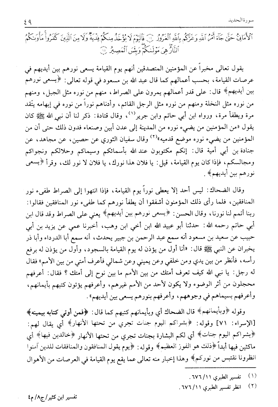 يَوْمَ تَرَى الْمُؤْمِنِينَ وَالْمُؤْمِناتِ يَسْعى نُورُهُمْ بَيْنَ أَيْدِيهِمْ وَبِأَيْمانِهِمْ بُشْراكُمُ الْيَوْمَ جَنَّاتٌ تَجْرِي مِنْ تَحْتِهَا الْأَنْهارُ خالِدِينَ فِيها ذلِكَ هُوَ الْفَوْزُ الْعَظِيمُ (12) يَوْمَ يَقُولُ الْمُنافِقُونَ وَالْمُنافِقاتُ لِلَّذِينَ آمَنُوا انْظُرُونا نَقْتَبِسْ مِنْ نُورِكُمْ قِيلَ ارْجِعُوا وَراءَكُمْ فَالْتَمِسُوا نُوراً فَضُرِبَ بَيْنَهُمْ بِسُورٍ لَهُ بابٌ باطِنُهُ فِيهِ الرَّحْمَةُ وَظاهِرُهُ مِنْ قِبَلِهِ الْعَذابُ (13) يُنادُونَهُمْ أَلَمْ نَكُنْ مَعَكُمْ قالُوا بَلى وَلكِنَّكُمْ فَتَنْتُمْ أَنْفُسَكُمْ وَتَرَبَّصْتُمْ وَارْتَبْتُمْ وَغَرَّتْكُمُ الْأَمانِيُّ حَتَّى جاءَ أَمْرُ اللَّهِ وَغَرَّكُمْ بِاللَّهِ الْغَرُورُ (14) فَالْيَوْمَ لَا يُؤْخَذُ مِنْكُمْ فِدْيَةٌ وَلا مِنَ الَّذِينَ كَفَرُوا مَأْواكُمُ النَّارُ هِيَ مَوْلاكُمْ وَبِئْسَ الْمَصِيرُ (15)