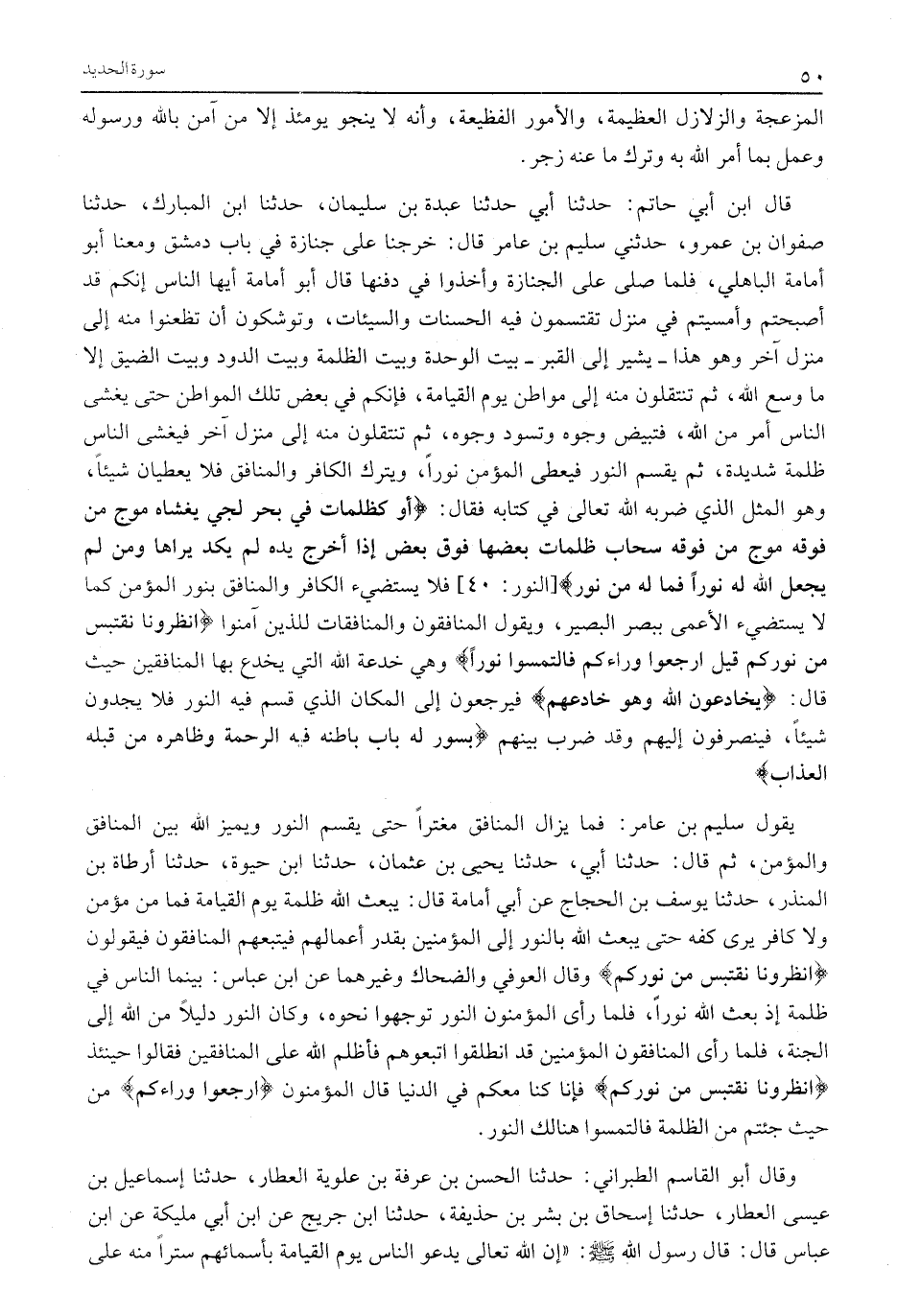 قَالَ ابْنُ أَبِي حَاتِمٍ: حَدَّثَنَا أَبِي حَدَّثَنَا عَبْدَةُ بْنُ سُلَيْمَانَ، حَدَّثَنَا ابْنُ الْمُبَارَكِ، حَدَّثَنَا صَفْوَانَ بْنِ عَمْرٍو، حَدَّثَنِي سُلَيْمُ بْنُ عَامِرٍ قَالَ: خَرَجْنَا عَلَى جِنَازَةٍ فِي بَابِ دِمَشْقَ وَمَعَنَا أَبُو أُمَامَةَ الْبَاهِلِيُّ، فَلَمَّا صَلَّى عَلَى الْجِنَازَةِ وَأَخَذُوا فِي دَفْنِهَا قَالَ أَبُو أُمَامَةَ أَيُّهَا النَّاسُ إِنَّكُمْ قَدْ أَصْبَحْتُمْ وَأَمْسَيْتُمْ فِي مَنْزِلٍ تَقْتَسِمُونَ فِيهِ الْحَسَنَاتِ وَالسَّيِّئَاتِ، وَتُوشِكُونَ أَنْ تَظْعَنُوا مِنْهُ إِلَى مَنْزِلٍ آخَرَ وَهُوَ هَذَا- يُشِيرُ إِلَى الْقَبْرِ- بَيْتُ الْوَحْدَةِ وَبَيْتُ الظُّلْمَةِ وَبَيْتُ الدُّودِ وَبَيْتُ الضِّيقِ إِلَّا ما وسع الله، ثم تَنْتَقِلُونَ مِنْهُ إِلَى مُوَاطِنِ يَوْمِ الْقِيَامَةِ، فَإِنَّكُمْ فِي بَعْضِ تِلْكَ الْمَوَاطِنِ حَتَّى يَغْشَى النَّاسَ أَمْرٌ مِنَ اللَّهِ، فَتَبْيَضَّ وُجُوهٌ وَتَسْوَدَّ وُجُوهٌ، ثم تنتقلون منه إلى منزل آخر فيغشى النَّاسَ ظُلْمَةٌ شَدِيدَةٌ، ثُمَّ يُقَسَّمُ النُّورُ فَيُعْطَى الْمُؤْمِنُ نُورًا، وَيُتْرَكُ الْكَافِرُ وَالْمُنَافِقُ فَلَا يُعْطَيَانِ شيئا، وهو المثل الذي ضربه الله تعالى في كتابه فقال: أَوْ كَظُلُماتٍ فِي بَحْرٍ لُجِّيٍّ يَغْشاهُ مَوْجٌ مِنْ فَوْقِهِ مَوْجٌ مِنْ فَوْقِهِ سَحابٌ ظُلُماتٌ بَعْضُها فَوْقَ بَعْضٍ إِذا أَخْرَجَ يَدَهُ لَمْ يَكَدْ يَراها وَمَنْ لَمْ يَجْعَلِ اللَّهُ لَهُ نُوراً فَما لَهُ مِنْ نُورٍ [النُّورِ: 40] فَلَا يَسْتَضِيءُ الْكَافِرُ وَالْمُنَافِقُ بِنُورِ الْمُؤْمِنِ كَمَا لَا يَسْتَضِيءُ الأعمى ببصر البصير، ويقول الْمُنَافِقُونَ وَالْمُنَافِقَاتُ لِلَّذِينَ آمَنُوا انْظُرُونا نَقْتَبِسْ مِنْ نُورِكُمْ قِيلَ ارْجِعُوا وَراءَكُمْ فَالْتَمِسُوا نُوراً وَهِيَ خدعة الله التي يخدع بِهَا الْمُنَافِقِينَ حَيْثُ قَالَ: يُخادِعُونَ اللَّهَ وَهُوَ خادِعُهُمْ