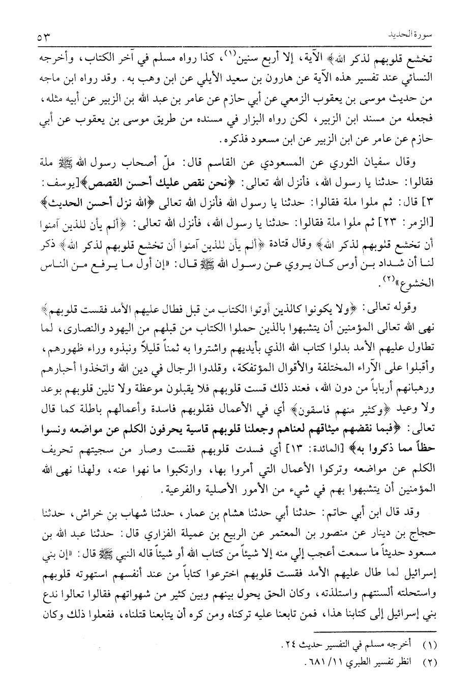 3] قَالَ: ثُمَّ مَلُّوا مَلَّةً فَقَالُوا: حَدِّثْنَا يَا رَسُولَ اللَّهِ فَأَنْزَلَ اللَّهُ تَعَالَى اللَّهُ نَزَّلَ أَحْسَنَ الْحَدِيثِ [الزُّمَرِ: 23] ثُمَّ مَلُّوا مَلَّةً فَقَالُوا: حَدِّثْنَا يَا رسول الله، فأنزل اللَّهُ تَعَالَى: أَلَمْ يَأْنِ لِلَّذِينَ آمَنُوا أَنْ تَخْشَعَ قُلُوبُهُمْ لِذِكْرِ اللَّهِ وَقَالَ قَتَادَةُ أَلَمْ يَأْنِ لِلَّذِينَ آمَنُوا أَنْ تَخْشَعَ قُلُوبُهُمْ لِذِكْرِ اللَّهِ ذُكِرَ لَنَا أَنَّ شَدَّادَ بْنَ أَوْسٍ كَانَ يَرْوِي عَنْ رَسُولِ اللَّهِ صَلَّى اللَّهُ عَلَيْهِ وَسَلَّمَ قَالَ: «إِنَّ أَوَّلَ مَا يُرْفَعُ مِنَ النَّاسِ الخشوع» «2» .