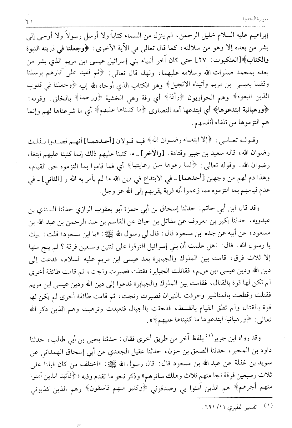 وَقَدْ قَالَ ابْنُ أَبِي حَاتِمٍ: حَدَّثَنَا إِسْحَاقُ بْنُ أَبِي حَمْزَةَ أَبُو يَعْقُوبَ الرَّازِيُّ حَدَّثَنَا السِّنْدِيُّ بْنُ عَبْدَوَيْهِ، حَدَّثَنَا بُكَيْرُ بْنُ مَعْرُوفٍ عَنْ مُقَاتِلِ بْنِ حَيَّانَ عَنِ الْقَاسِمِ بْنِ عَبْدِ الرَّحْمَنِ بْنِ عَبْدِ اللَّهِ بْنِ مَسْعُودٍ، عَنْ أَبِيهِ عَنْ جَدِّهِ ابْنِ مَسْعُودٍ قَالَ: قَالَ لِي رَسُولُ اللَّهِ صَلَّى اللَّهُ عَلَيْهِ وَسَلَّمَ: «يَا ابْنَ مَسْعُودٍ» قُلْتُ: لَبَّيْكَ يَا رَسُولَ اللَّهِ. قَالَ: «هَلْ عَلِمْتَ أَنَّ بَنِي إِسْرَائِيلَ افْتَرَقُوا عَلَى ثِنْتَيْنِ وَسَبْعِينَ فِرْقَةً؟ لَمْ يَنْجُ مِنْهَا إِلَّا ثَلَاثُ فِرَقٍ، قَامَتْ بَيْنَ الْمُلُوكِ وَالْجَبَابِرَةِ بَعْدَ عِيسَى ابْنِ مَرْيَمَ عَلَيْهِ السَّلَامُ، فَدَعَتْ إِلَى دِينِ اللَّهِ وَدِينِ عِيسَى ابْنِ مَرْيَمَ، فَقَاتَلَتِ الْجَبَابِرَةَ فَقُتِّلَتْ فَصَبَرَتْ وَنَجَتْ، ثم قامت طائفة أخرى لم تكن لَهَا قُوَّةٌ بِالْقِتَالِ، فَقَامَتْ بَيْنَ الْمُلُوكِ وَالْجَبَابِرَةِ فَدَعَوْا إِلَى دِينِ اللَّهِ وَدِينِ عِيسَى ابْنِ مَرْيَمَ فَقُتِّلَتْ وَقُطِّعَتْ بِالْمَنَاشِيرِ وَحُرِّقَتْ بِالنِّيرَانِ فَصَبَرَتْ وَنَجَتْ، ثُمَّ قَامَتْ طَائِفَةٌ أُخْرَى لَمْ يَكُنْ لَهَا قُوَّةٌ بِالْقِتَالِ وَلَمْ تُطِقِ الْقِيَامَ بِالْقِسْطِ، فلحقت بالجبال فتعبدت وترهبت وهم الذين ذكر الله تعالى: وَرَهْبانِيَّةً ابْتَدَعُوها مَا كَتَبْناها عَلَيْهِمْ» .