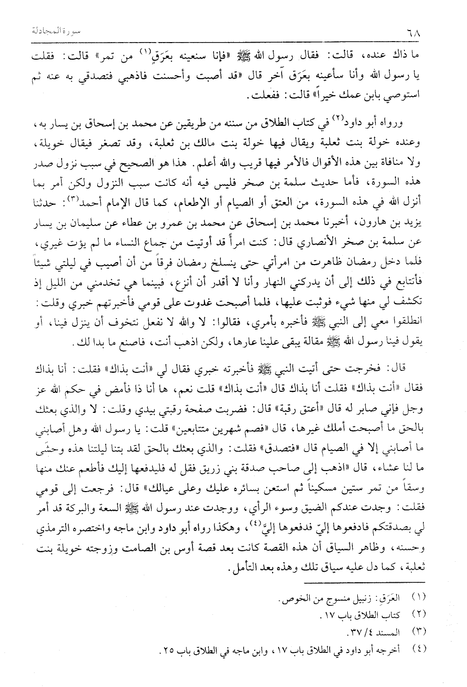 وَرَوَاهُ أَبُو دَاوُدَ «2» فِي كِتَابِ الطَّلَاقِ مِنْ سُنَنِهِ مِنْ طَرِيقَيْنِ عَنْ مُحَمَّدِ بْنِ إِسْحَاقَ بْنِ يَسَارٍ بِهِ، وَعِنْدَهُ خَوْلَةُ بِنْتُ ثَعْلَبَةَ وَيُقَالُ فِيهَا خَوْلَةُ بِنْتُ مَالِكِ بْنِ ثَعْلَبَةَ، وَقَدْ تُصَغَّرُ فَيُقَالُ خُوَيْلَةُ، وَلَا مُنَافَاةَ بَيْنَ هَذِهِ الْأَقْوَالِ فَالْأَمْرُ فِيهَا قَرِيبٌ وَاللَّهُ أَعْلَمُ. هَذَا هُوَ الصَّحِيحُ فِي سَبَبِ نُزُولِ صَدْرِ هَذِهِ السُّورَةِ، فَأَمَّا حَدِيثُ سَلَمَةَ بْنِ صَخْرٍ فَلَيْسَ فيه أنه كانت سَبَبَ النُّزُولِ وَلَكِنْ أَمْرٌ بِمَا أَنْزَلَ اللَّهُ فِي هَذِهِ السُّورَةِ، مِنَ الْعِتْقِ أَوِ الصِّيَامِ أَوِ الْإِطْعَامِ، كَمَا قَالَ الْإِمَامُ أَحْمَدُ»