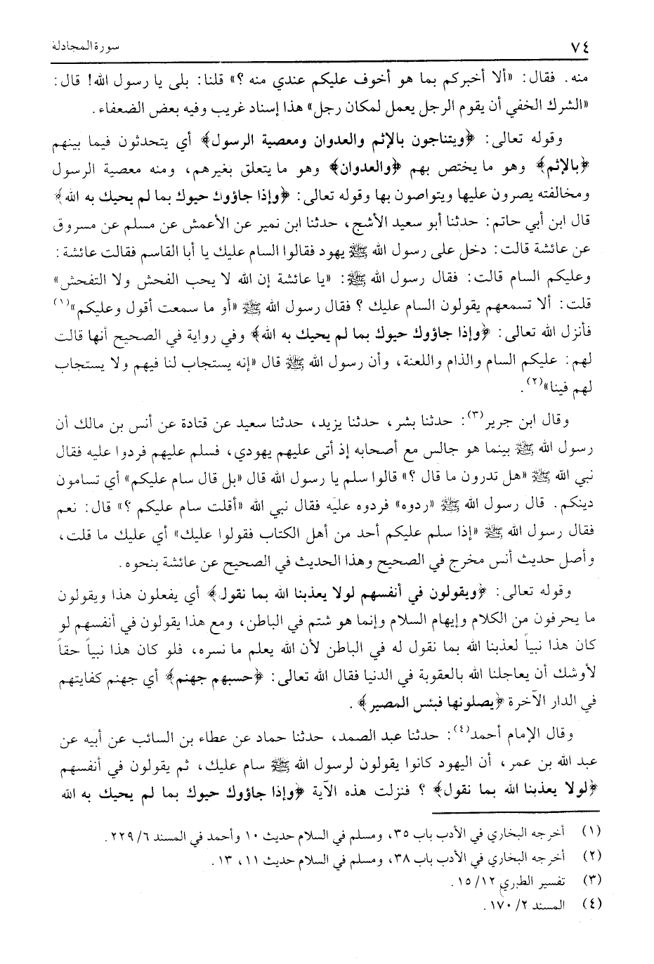 وقوله تعالى: وَيَتَناجَوْنَ بِالْإِثْمِ وَالْعُدْوانِ وَمَعْصِيَةِ الرَّسُولِ أَيْ يَتَحَدَّثُونَ فِيمَا بَيْنَهُمْ بِالْإِثْمِ وَهُوَ مَا يَخْتَصُّ بِهِمْ وَالْعُدْوانِ وَهُوَ مَا يَتَعَلَّقُ بِغَيْرِهِمْ، وَمِنْهُ مَعْصِيَةُ الرَّسُولِ وَمُخَالَفَتُهُ يُصِرُّونَ عَلَيْهَا ويتواصون بها وقوله تعالى: وَإِذا جاؤُكَ حَيَّوْكَ بِما لَمْ يُحَيِّكَ بِهِ اللَّهُ قَالَ ابْنُ أَبِي حَاتِمٍ: حَدَّثَنَا أَبُو سَعِيدٍ الْأَشَجُّ، حَدَّثَنَا ابْنُ نُمَيْرٍ عَنِ الْأَعْمَشِ عَنْ مُسْلِمٍ عَنْ مَسْرُوقٍ عَنْ عَائِشَةَ قَالَتْ: دَخَلَ عَلَيَّ رَسُولُ اللَّهِ صَلَّى اللَّهُ عَلَيْهِ وَسَلَّمَ يَهُودُ فَقَالُوا السَّامُ عَلَيْكَ يَا أَبَا الْقَاسِمِ فَقَالَتْ عائشة: