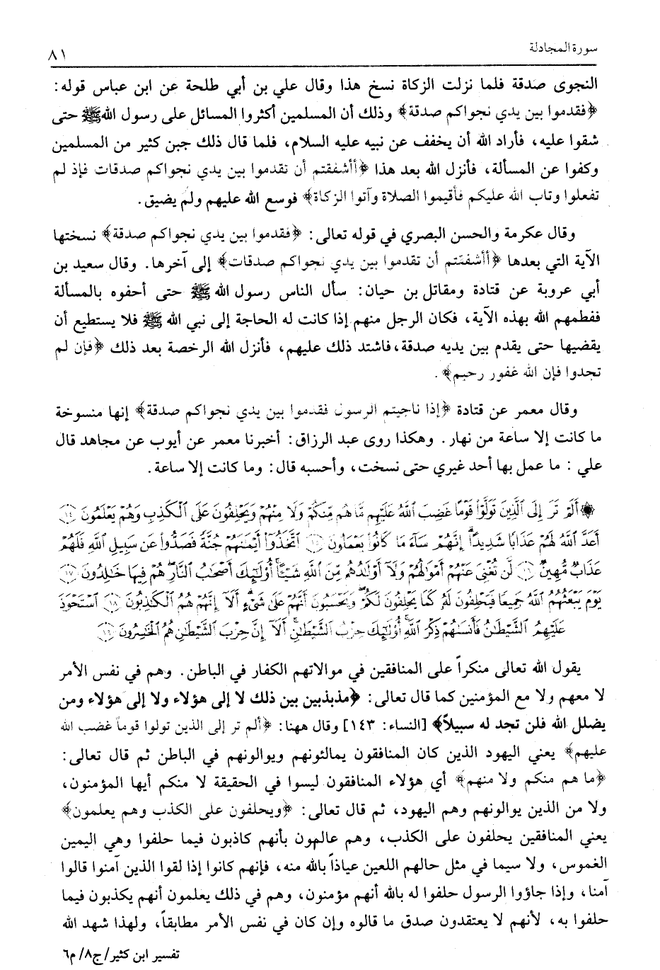 أَلَمْ تَرَ إِلَى الَّذِينَ تَوَلَّوْا قَوْماً غَضِبَ اللَّهُ عَلَيْهِمْ مَا هُمْ مِنْكُمْ وَلا مِنْهُمْ وَيَحْلِفُونَ عَلَى الْكَذِبِ وَهُمْ يَعْلَمُونَ (14) أَعَدَّ اللَّهُ لَهُمْ عَذاباً شَدِيداً إِنَّهُمْ ساءَ مَا كانُوا يَعْمَلُونَ (15) اتَّخَذُوا أَيْمانَهُمْ جُنَّةً فَصَدُّوا عَنْ سَبِيلِ اللَّهِ فَلَهُمْ عَذابٌ مُهِينٌ (16) لَنْ تُغْنِيَ عَنْهُمْ أَمْوالُهُمْ وَلا أَوْلادُهُمْ مِنَ اللَّهِ شَيْئاً أُولئِكَ أَصْحابُ النَّارِ هُمْ فِيها خالِدُونَ (17) يَوْمَ يَبْعَثُهُمُ اللَّهُ جَمِيعاً فَيَحْلِفُونَ لَهُ كَما يَحْلِفُونَ لَكُمْ وَيَحْسَبُونَ أَنَّهُمْ عَلى شَيْءٍ أَلا إِنَّهُمْ هُمُ الْكاذِبُونَ (18)