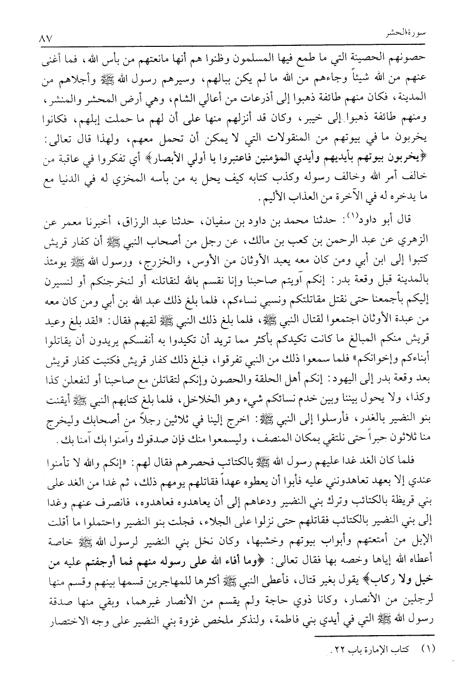 قَالَ أَبُو دَاوُدَ «1» : حَدَّثَنَا مُحَمَّدُ بْنُ دَاوُدَ بْنِ سفيان، حَدَّثَنَا عَبْدُ الرَّزَّاقِ، أَخْبَرَنَا مَعْمَرٌ عَنِ الزُّهْرِيِّ عَنْ عَبْدِ الرَّحْمَنِ بْنِ كَعْبِ بْنِ مَالِكٍ، عَنْ رَجُلٍ مِنْ أَصْحَابِ النَّبِيِّ صَلَّى اللَّهُ عَلَيْهِ وَسَلَّمَ أَنَّ كُفَّارَ قُرَيْشٍ كَتَبُوا إِلَى ابن أبي ومن كان معه يعبد الْأَوْثَانَ مِنَ الْأَوْسِ، وَالْخَزْرَجِ، وَرَسُولُ اللَّهِ صَلَّى اللَّهُ عَلَيْهِ وَسَلَّمَ يَوْمَئِذٍ بِالْمَدِينَةِ قَبْلَ وَقْعَةِ بَدْرٍ: إِنَّكُمْ آوَيْتُمْ صَاحِبَنَا وَإِنَّا نُقْسِمُ بِاللَّهِ لنقاتلنه أو لنخرجنكم أَوْ لَنَسِيرَنَّ إِلَيْكُمْ بِأَجْمَعِنَا حَتَّى نَقْتُلَ مُقَاتِلَتَكُمْ ونسبي نِسَاءَكُمْ، فَلَمَّا بَلَغَ ذَلِكَ عَبْدَ اللَّهِ بْنَ أُبَيٍّ وَمَنْ كَانَ مَعَهُ مِنْ عَبَدَةِ الْأَوْثَانِ اجْتَمَعُوا لِقِتَالِ النَّبِيِّ صَلَّى اللَّهُ عَلَيْهِ وَسَلَّمَ، فَلَمَّا بَلَغَ ذَلِكَ النَّبِيَّ صَلَّى اللَّهُ عَلَيْهِ وَسَلَّمَ لَقِيَهُمْ فَقَالَ: «لَقَدْ بَلَغَ وَعِيدُ قُرَيْشٍ مِنْكُمُ الْمَبَالِغَ مَا كَانَتْ تَكِيدُكُمْ بِأَكْثَرَ مِمَّا تريد أن تكيدوا به أنفسكم يريدون أن يقاتلوا أَبْنَاءَكُمْ وَإِخْوَانَكُمْ» فَلَمَّا سَمِعُوا ذَلِكَ مِنَ النَّبِيِّ تَفَرَّقُوا، فَبَلَغَ ذَلِكَ كَفَّارَ قُرَيْشٍ فَكَتَبَتْ كَفَّارُ قُرَيْشٍ بَعْدَ وَقْعَةِ بَدْرٍ إِلَى الْيَهُودِ: إِنَّكُمْ أَهْلُ الْحَلْقَةِ وَالْحُصُونِ وَإِنَّكُمْ لَتُقَاتِلُّنَ مَعَ صَاحِبِنَا أَوْ لَنَفْعَلَنَّ كَذَا وَكَذَا، وَلَا يَحُولُ بَيْنَنَا وبين خدم نسائكم شيء وهو الخلاخل، فَلَمَّا بَلَغَ كِتَابُهُمُ النَّبِيَّ صَلَّى اللَّهُ عَلَيْهِ وسلّم أيقنت بَنُو النَّضِيرِ بِالْغَدْرِ، فَأَرْسَلُوا إِلَى النَّبِيِّ صَلَّى اللَّهُ عَلَيْهِ وَسَلَّمَ: اخْرُجْ إِلَيْنَا فِي ثَلَاثِينَ رجلا من أصحابك وليخرج مِنَّا ثَلَاثُونَ حَبْرًا حَتَّى نَلْتَقِيَ بِمَكَانِ الْمَنْصَفِ، وليسمعوا مِنْكَ فَإِنْ صَدَّقُوكَ وَآمَنُوا بِكَ آمَنَّا بِكَ.