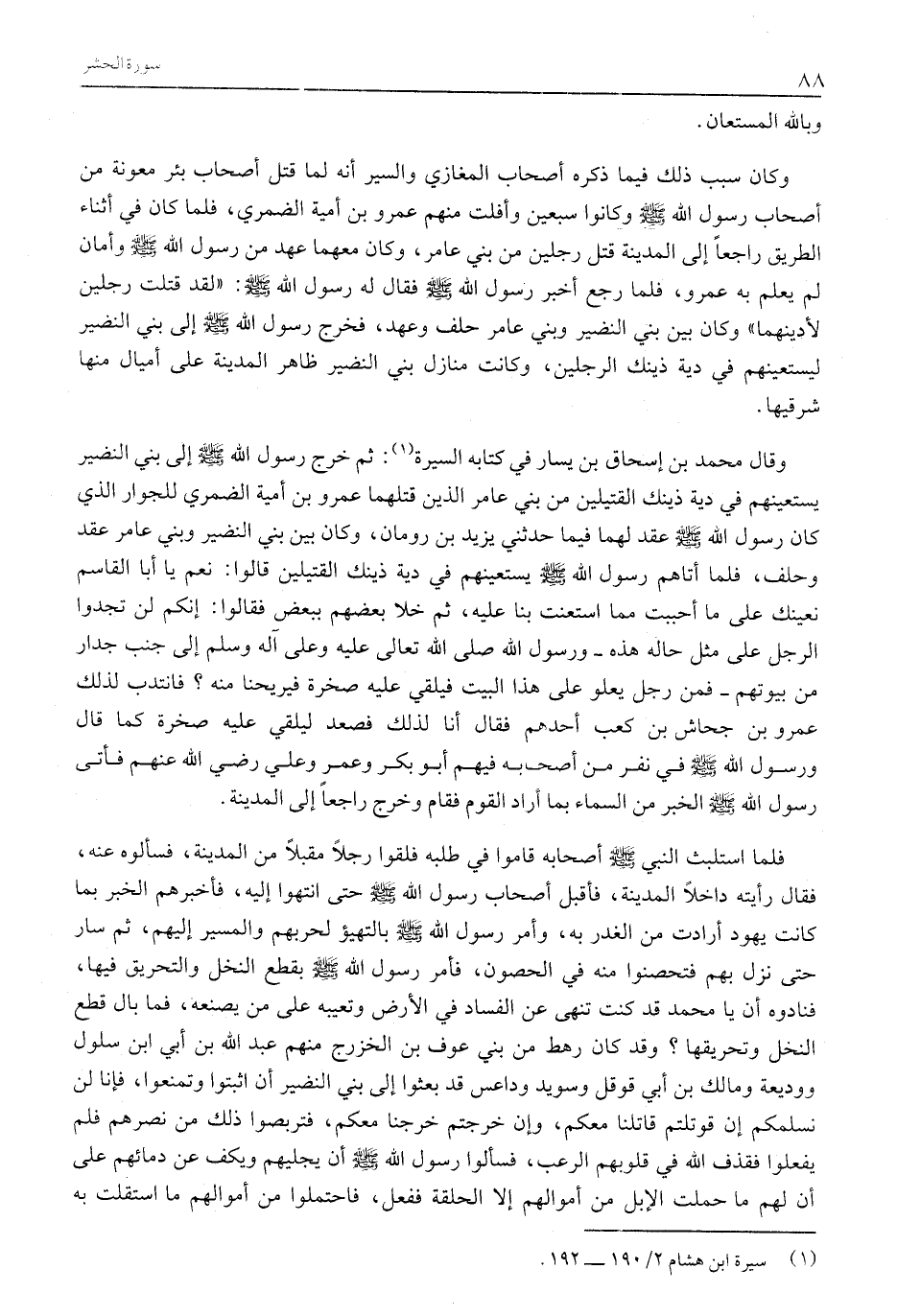 وقال مُحَمَّدُ بْنُ إِسْحَاقَ بْنِ يَسَارٍ فِي كِتَابِهِ السيرة «1» : ثُمَّ خَرَجَ رَسُولُ اللَّهِ صَلَّى اللَّهُ عَلَيْهِ وَسَلَّمَ إِلَى بَنِي النَّضِيرِ يَسْتَعِينُهُمْ فِي دِيَةِ ذَيْنِكَ القتيلين من بني عامر الذين قتلهما عَمْرُو بْنُ أُمَيَّةَ الضَّمْرِيُّ لِلْجِوَارِ الَّذِي كَانَ رَسُولُ اللَّهِ صَلَّى اللَّهُ عَلَيْهِ وَسَلَّمَ عَقَدَ لَهُمَا فِيمَا حَدَّثَنِي يَزِيدُ بْنُ رُومَانَ، وَكَانَ بَيْنَ بَنِي النَّضِيرِ وَبَنِي عَامِرٍ عَقْدٌ وَحِلْفٌ، فَلَمَّا أَتَاهُمْ رَسُولُ اللَّهِ صَلَّى اللَّهُ عَلَيْهِ وَسَلَّمَ يَسْتَعِينُهُمْ فِي دِيَةِ ذَيْنِكَ الْقَتِيلَيْنِ قَالُوا: نَعَمْ يَا أَبَا الْقَاسِمِ نُعِينُكَ عَلَى مَا أَحْبَبْتَ مِمَّا اسْتَعَنْتَ بِنَا عَلَيْهِ، ثُمَّ خَلَا بَعْضُهُمْ بِبَعْضٍ فَقَالُوا: إِنَّكُمْ لَنْ تَجِدُوا الرَّجُلَ عَلَى مِثْلِ حَالِهِ هَذِهِ- وَرَسُولُ اللَّهِ صَلَّى الله تعالى عليه وعلى آله وَسَلَّمَ إِلَى جَنْبِ جِدَارٍ مِنْ بُيُوتِهِمْ- فَمَنْ رَجُلٌ يَعْلُو عَلَى هَذَا الْبَيْتِ فَيُلْقِي عَلَيْهِ صَخْرَةً فَيُرِيحُنَا مِنْهُ؟ فَانْتُدِبَ لِذَلِكَ عَمْرُو بْنُ جِحَاشِ بْنِ كَعْبٍ أَحَدُهُمْ فَقَالَ أَنَا لِذَلِكَ فَصَعِدَ لِيُلْقِيَ عَلَيْهِ صَخْرَةً كَمَا قَالَ وَرَسُولُ اللَّهِ صَلَّى اللَّهُ عَلَيْهِ وَسَلَّمَ فِي نَفَرٍ مِنْ أَصْحَابِهِ فِيهِمْ أَبُو بَكْرٍ وَعُمَرُ وَعَلِيٌّ رَضِيَ اللَّهُ عَنْهُمْ فَأَتَى رَسُولَ اللَّهِ صَلَّى اللَّهُ عَلَيْهِ وَسَلَّمَ الْخَبَرُ مِنَ السَّمَاءِ بِمَا أَرَادَ الْقَوْمُ فَقَامَ وَخَرَجَ رَاجِعًا إِلَى الْمَدِينَةِ.