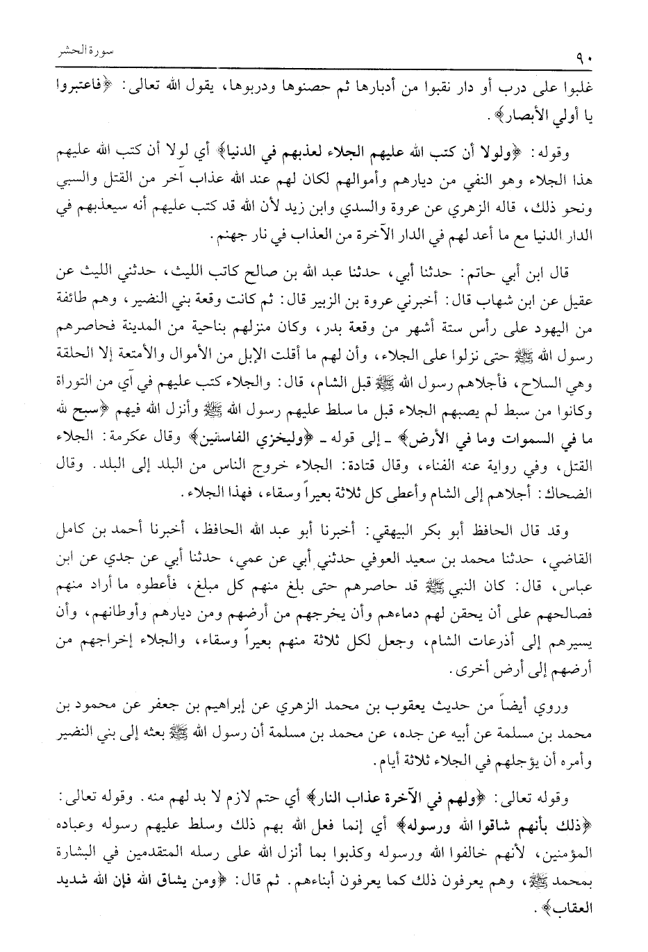 قَالَ ابْنُ أَبِي حَاتِمٍ: حَدَّثَنَا أَبِي، حَدَّثَنَا عَبْدُ اللَّهِ بْنُ صَالِحٍ كَاتِبُ اللَّيْثِ، حَدَّثَنِي اللَّيْثِ عَنْ عَقِيلٌ عَنِ ابْنِ شِهَابٍ قَالَ: أَخْبَرَنِي عُرْوَةُ بْنُ الزُّبَيْرِ قَالَ: ثُمَّ كَانَتْ وَقْعَةُ بَنِي النَّضِيرِ، وَهُمْ طَائِفَةٌ مِنَ الْيَهُودِ عَلَى رَأْسِ سِتَّةِ أَشْهُرٍ مِنْ وَقْعَةِ بَدْرٍ، وَكَانَ مَنْزِلُهُمْ بِنَاحِيَةٍ مِنَ الْمَدِينَةِ فَحَاصَرَهُمْ رَسُولُ اللَّهِ صَلَّى اللَّهُ عَلَيْهِ وَسَلَّمَ حتى نزلوا على الْجَلَاءِ، وَأَنَّ لَهُمْ مَا أَقَلَّتِ الْإِبِلُ مِنَ الْأَمْوَالِ وَالْأَمْتِعَةِ إِلَّا الْحَلْقَةَ وَهِيَ السِّلَاحُ، فَأَجْلَاهُمْ رَسُولَ اللَّهِ صَلَّى اللَّهُ عَلَيْهِ وَسَلَّمَ قَبْلَ الشام، قال: والجلاء كَتَبَ عَلَيْهِمْ فِي آيٍ مِنَ التَّوْرَاةِ وَكَانُوا مِنْ سِبْطٍ لَمْ يُصِبْهُمُ الْجَلَاءُ قَبْلَ مَا سلط عَلَيْهِمْ رَسُولُ اللَّهِ صَلَّى اللَّهُ عَلَيْهِ وَسَلَّمَ وَأَنْزَلَ اللَّهُ فِيهِمْ سَبَّحَ لِلَّهِ مَا فِي السَّماواتِ وَما فِي الْأَرْضِ- إِلَى قَوْلِهِ- وَلِيُخْزِيَ الْفاسِقِينَ وَقَالَ عِكْرِمَةُ: الْجَلَاءُ الْقَتْلُ، وَفِي رِوَايَةٍ عَنْهُ الْفَنَاءُ، وَقَالَ قَتَادَةُ: الْجَلَاءُ خُرُوجُ النَّاسِ مِنَ الْبَلَدِ إِلَى الْبَلَدِ. وَقَالَ الضَّحَّاكُ: أَجْلَاهُمْ إِلَى الشَّامِ وَأَعْطَى كُلَّ ثَلَاثَةٍ بَعِيرًا وَسِقَاءً، فَهَذَا الْجَلَاءُ.