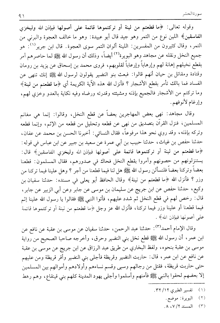 وَقَالَ الْإِمَامُ أَحْمَدُ «3» : حَدَّثَنَا عَبْدُ الرَّحْمَنِ، حَدَّثَنَا سُفْيَانُ عَنْ مُوسَى بْنِ عُقْبَةَ عَنْ نَافِعٍ عَنِ ابْنِ عُمَرَ، أَنَّ رَسُولَ اللَّهِ صَلَّى اللَّهُ عَلَيْهِ وَسَلَّمَ قَطَعَ نَخْلَ بَنِي النَّضِيرِ وَحَرَّقَ، وَأَخْرَجَهُ صَاحِبَا الصَّحِيحِ مِنْ رِوَايَةِ مُوسَى بْنِ عُقْبَةَ بِنَحْوِهِ، وَلَفْظِ الْبُخَارِيِّ مِنْ طَرِيقِ عَبْدِ الرَّزَّاقِ عَنِ ابْنِ جُرَيْجٍ عَنْ مُوسَى بْنِ عُقْبَةَ عَنْ نَافِعٍ عَنِ ابْنِ عُمَرَ، قَالَ: حَارَبَتِ النَّضِيرُ وَقُرَيْظَةُ فَأَجْلَى بَنِي النَّضِيرِ وَأَقَرَّ قُرَيْظَةَ وَمَنَّ عَلَيْهِمْ حَتَّى حَارَبَتْ قُرَيْظَةُ، فَقَتَلَ مِنْ رجالهم وسبى وَقَسَّمَ نِسَاءَهُمْ وَأَوْلَادَهُمْ وَأَمْوَالَهُمْ بَيْنَ الْمُسْلِمِينَ إِلَّا بَعْضَهُمْ لَحِقُوا بِالنَّبِيِّ صَلَّى اللَّهُ عَلَيْهِ وَسَلَّمَ فَأَمَّنَهُمْ وَأَسْلَمُوا وَأَجْلَى يَهُودَ الْمَدِينَةِ كُلَّهُمْ بَنِي قينقاع، وهم رهط