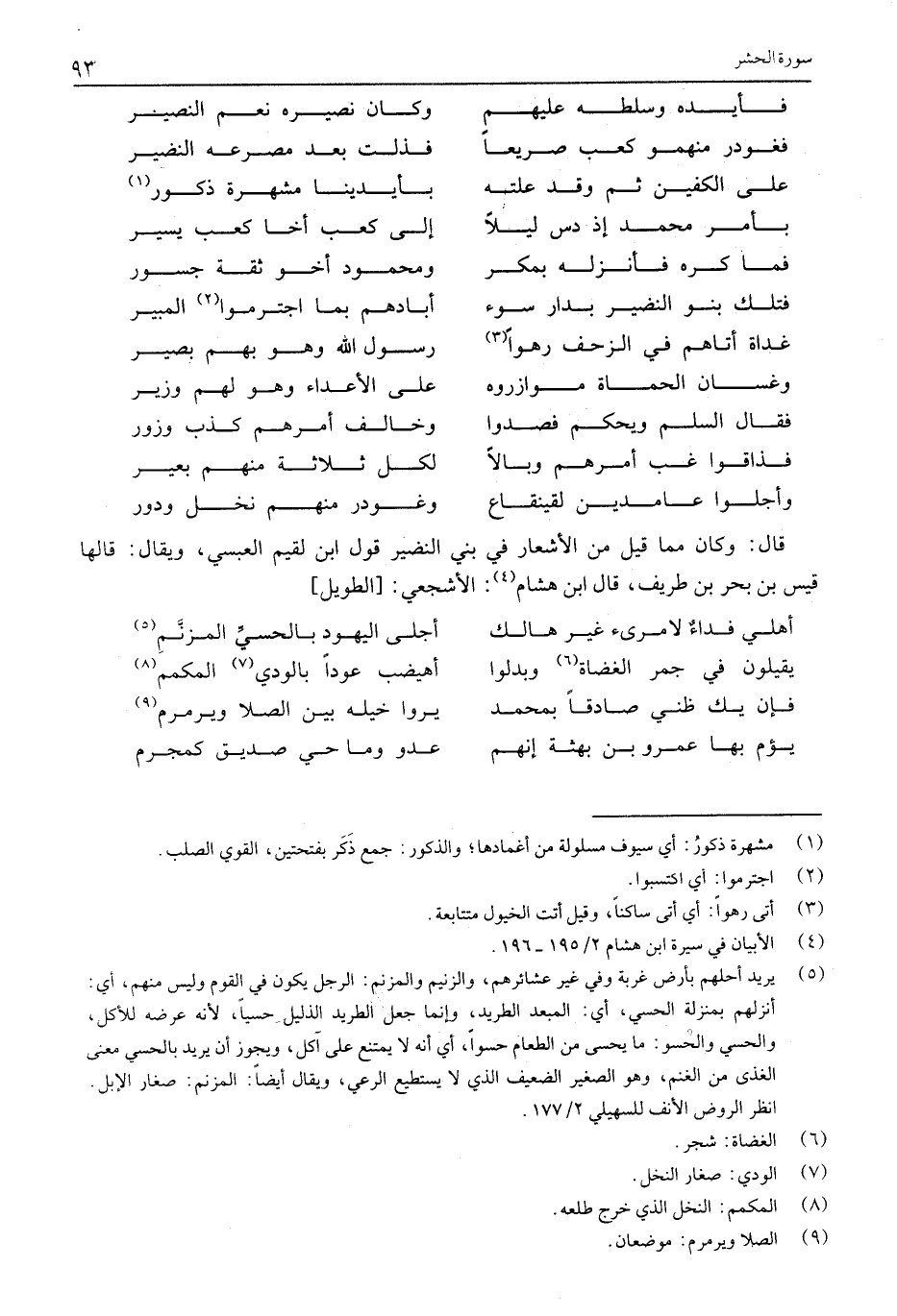 قَالَ: وَكَانَ مِمَّا قِيلَ مِنَ الْأَشْعَارِ فِي بَنِي النَّضِيرِ قَوْلُ ابْنِ لُقَيْمٍ الْعَبْسِيِّ، وَيُقَالُ: قَالَهَا قَيْسُ بْنُ بَحْرِ بْنِ طَرِيفٍ، قَالَ ابْنُ هِشَامٍ «4» : الْأَشْجَعِيُّ: [الطويل]