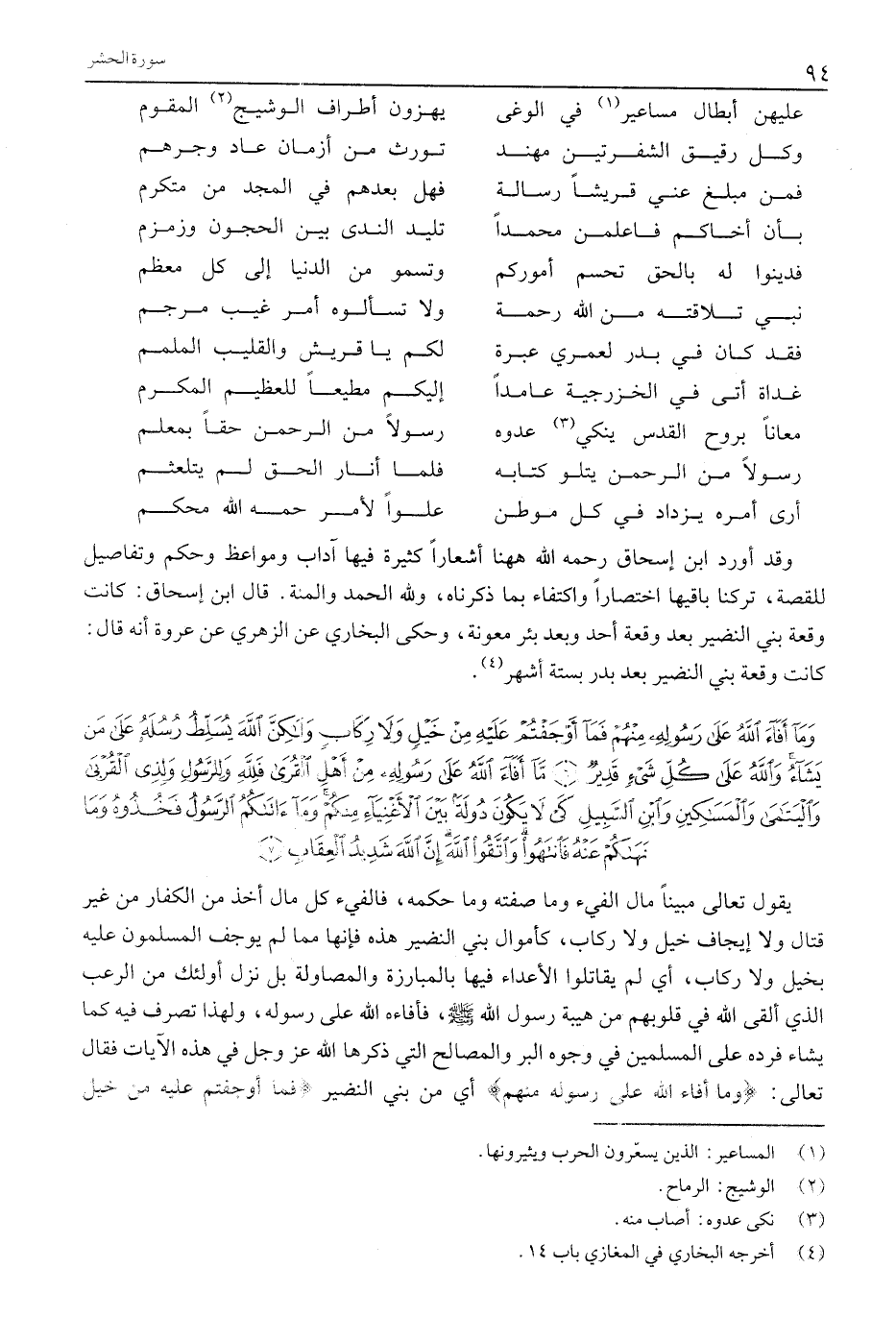 وَما أَفاءَ اللَّهُ عَلى رَسُولِهِ مِنْهُمْ فَما أَوْجَفْتُمْ عَلَيْهِ مِنْ خَيْلٍ وَلا رِكابٍ وَلكِنَّ اللَّهَ يُسَلِّطُ رُسُلَهُ عَلى مَنْ يَشاءُ وَاللَّهُ عَلى كُلِّ شَيْءٍ قَدِيرٌ (6) مَا أَفاءَ اللَّهُ عَلى رَسُولِهِ مِنْ أَهْلِ الْقُرى فَلِلَّهِ وَلِلرَّسُولِ وَلِذِي الْقُرْبى وَالْيَتامى وَالْمَساكِينِ وَابْنِ السَّبِيلِ كَيْ لَا يَكُونَ دُولَةً بَيْنَ الْأَغْنِياءِ مِنْكُمْ وَما آتاكُمُ الرَّسُولُ فَخُذُوهُ وَما نَهاكُمْ عَنْهُ فَانْتَهُوا وَاتَّقُوا اللَّهَ إِنَّ اللَّهَ شَدِيدُ الْعِقابِ (7)