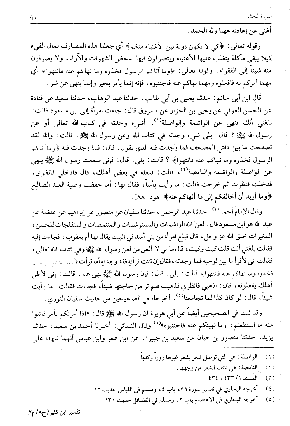 وَقَالَ الْإِمَامُ أَحْمَدُ «3» : حَدَّثَنَا عَبْدُ الرَّحْمَنِ، حَدَّثَنَا سُفْيَانُ عَنْ مَنْصُورٍ عَنْ إِبْرَاهِيمَ عَنْ عَلْقَمَةَ عَنْ عَبْدِ اللَّهِ هُوَ ابْنُ مَسْعُودٍ قَالَ: لَعَنَ اللَّهُ الْوَاشِمَاتِ وَالْمُسْتَوْشِمَاتِ وَالْمُتَنَمِّصَاتِ وَالْمُتَفَلِّجَاتِ لِلْحُسْنِ، الْمُغَيِّرَاتِ خَلْقَ اللَّهِ عَزَّ وَجَلَّ، قَالَ فَبَلَغَ امرأة من بني أسد فِي الْبَيْتِ يُقَالُ لَهَا أُمُّ يَعْقُوبَ، فَجَاءَتْ إِلَيْهِ فَقَالَتْ بَلَغَنِي أَنَّكَ قُلْتَ كَيْتَ وَكَيْتَ، قَالَ مَا لِي لَا أَلْعَنُ مَنْ لَعَنَ رَسُولُ اللَّهِ صَلَّى اللَّهُ عَلَيْهِ وَسَلَّمَ وَفِي كتاب الله تعالى، فَقَالَتْ إِنِّي لَأَقْرَأُ مَا بَيْنَ لَوْحَيْهِ فَمَا وجدته، فقال إن كنت قرأته فقد وجدته أَمَا قَرَأْتِ وَما آتاكُمُ الرَّسُولُ فَخُذُوهُ وَما نَهاكُمْ عَنْهُ فَانْتَهُوا قَالَتْ: بَلَى. قَالَ: فَإِنَّ رَسُولَ اللَّهِ صَلَّى اللَّهُ عَلَيْهِ وَسَلَّمَ نَهَى عَنْهُ. قَالَتْ: إِنِّي لَأَظُنُّ أَهْلَكَ يَفْعَلُونَهُ، قَالَ: اذْهَبِي فَانْظُرِي فَذَهَبَتْ فَلَمْ تَرَ مِنْ حَاجَتِهَا شَيْئًا، فَجَاءَتْ فَقَالَتْ: مَا رَأَيْتُ شَيْئًا، قَالَ: لو كان كذا لما تُجَامِعْنَا «4» . أَخْرَجَاهُ فِي الصَّحِيحَيْنِ مِنْ حَدِيثِ سُفْيَانَ الثَّوْرِيِّ.