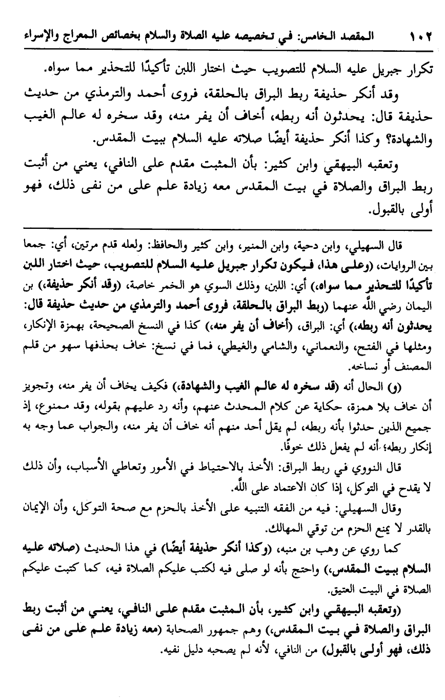 "وتعقبه البيهقي وابن كثير، بأن المثبت مقدم على النافي، يعني من أثبت ربط البراق والصلاة في بيت لمقدس"، وهم جمهور الصحابة "معه زيادة علم على من نفى ذلك، فهو أولى بالقبول" من النافي؛ لأنه لم يصحبه دليل نفيه.