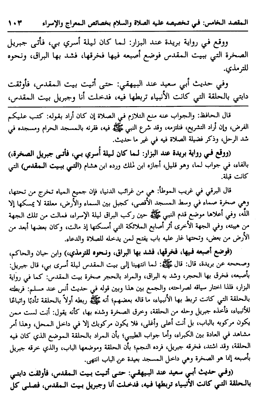 "وفي حديث أبي سعيد عند البيهقي: حتى أتيت بيت المقدس، فأوثقت دابتي بالحلقة التي كانت الأنبياء تربطها فيه، فدخلت أنا وجبريل بيت المقدس، فصلى كل