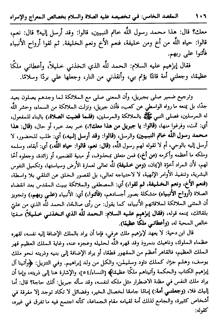 وترجيح ضمير صلى بجبريل، وأن المعنى صلى مع الملائكة لما وجدهم يصلون بعيد جدًا، بل يمنعه ما رواه الواسطي عن كعب، فأذن جبريل، ونزلت الملائكة من السماء، وحشر الله له المرسلين، فصلى النبي -صلى الله عليه وسلم- بالملائكة والمرسلين، "فلما قضيت الصلاة"، بالنباء للمفعول، أي: تمت، وفرغوا منها، "قالوا: يا جبريل من هذا معك"؟، خبر بعد خبر، أو حال، "قال: هذا محمد رسول الله خاتم النبيين" والرسل، "قالوا: وقد أرسله إليه"، أي: طلب للحضور، لا أرسل إليه بالوحي، أم لا لقوله لهم رسول الله، "قال: نعم، قالوا: حياه الله"، أي: أبقاه، وسلمه وملكه ما أعظمه وأكرمه "من أخ"، فمن متعلق بمحذوف، أو مبنية للضمير، أو زائدة، وجعلواه أخا لهم؛ لأن المراد أخوة الإيمان، "ومن خليفة" لله تعالى لعمارة الأرض وسياستها، وتكميل النفوس البشرية، وتنفيذ الأوامر الإلهية، لا لاحتياجه تعالى، بل لقصور الخلق عن التلقي بلا واسطة فنعم الأخ، ونعم الخليفة، ثم لقوا"، أي: المصطفى واملائكة ببيت المقدس بعد انقضاء الصلاة "أرواح الأنبياء" متشكلة بصور أجسادهم، "فأثنوا"، أي: الأنبياء "على ربهم"، وتجويز أن المثنى الملائكة لملاقاتهم الأنبياء، كما يقول: من رأى صالحًا، الحمد لله الذي من علي بلقائك، يمنعه قوله، "فقال إبراهيم عليه السلام: الحمد لله الذي اتخذني خليلًا" صفيًا خالص المحبة له، "وأعطاني ملكًا عظيمًا".
