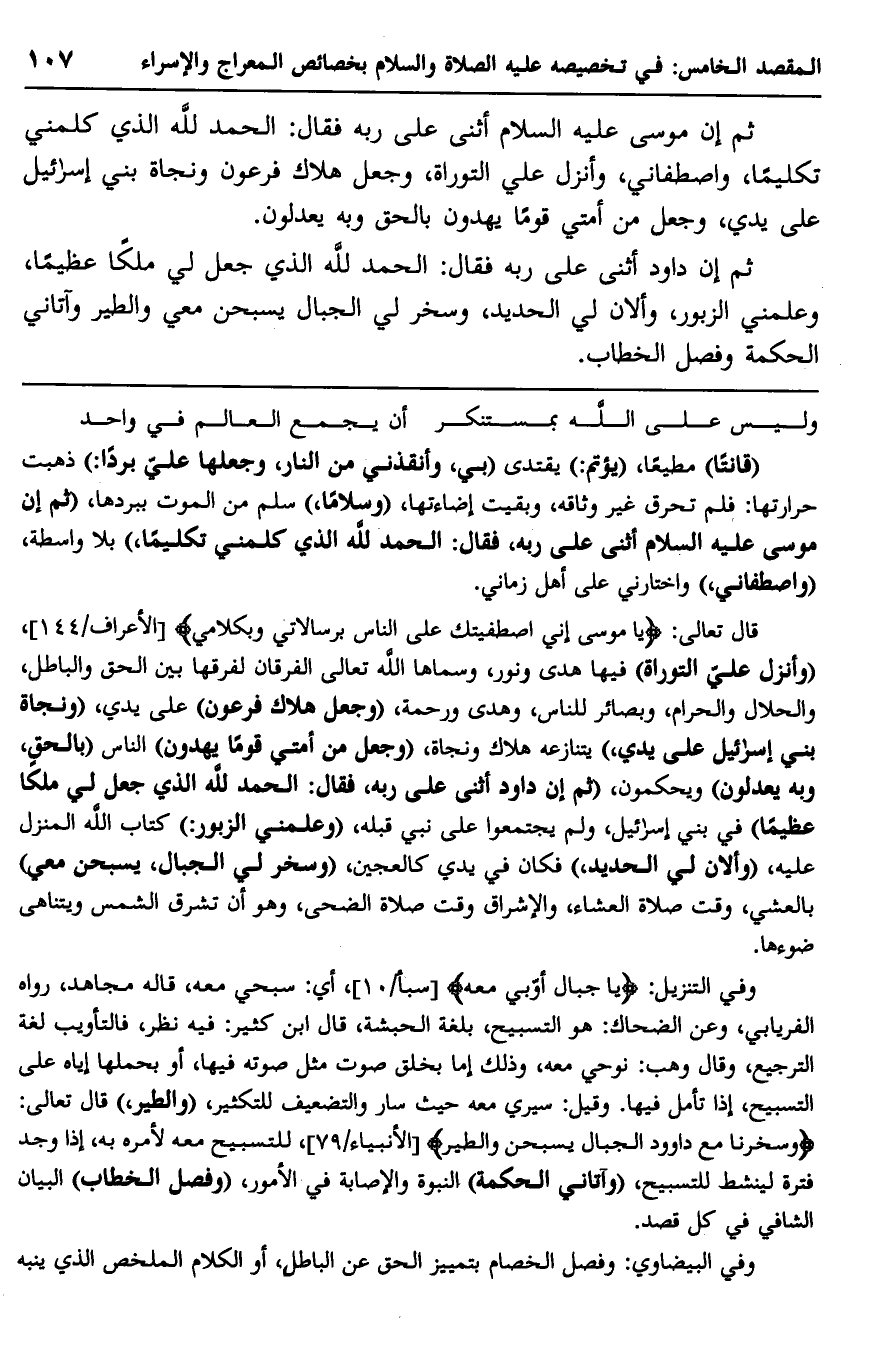 قال تعالى: {يَا مُوسَى إِنِّي اصْطَفَيْتُكَ عَلَى النَّاسِ بِرِسَالَاتِي وَبِكَلَامِي} [الأعراف: 144] ، "وأنزل علي التوراة" فيها هدى ونور، وسماها الله تعالى الفرقان لفرقها بين الحق والباطل، والحلال والحرام، وبصائر للناس، وهدى ورحمة، "وجعل هلاك فرعون" على يدي، "ونجاة بني إسرائيل على يدي"، يتنازعه هلالك ونجاة، "وجعل من أمتي قومًا يهدون" الناس "بالحق، وبه يعدلون" ويحكمون، "ثم إن داود أثنى على ربه، فقال: الحمد لله الذي جعل لي ملكًا عظيمًا" في بني إسرائيل، ولم يجتمعوا على نبي قبله، "وعلمني الزبور": كتاب الله المنزل عليه، "وألان في الحديد"، فكان في يدي كالعجين، "وسخر لي الجبال، يسبحن معي" بالعشي، وقت صلاة العشاء، والإشراق وقت صلاة الضحى، وهو أن تشرق الشمس ويتناهى ضوءها.