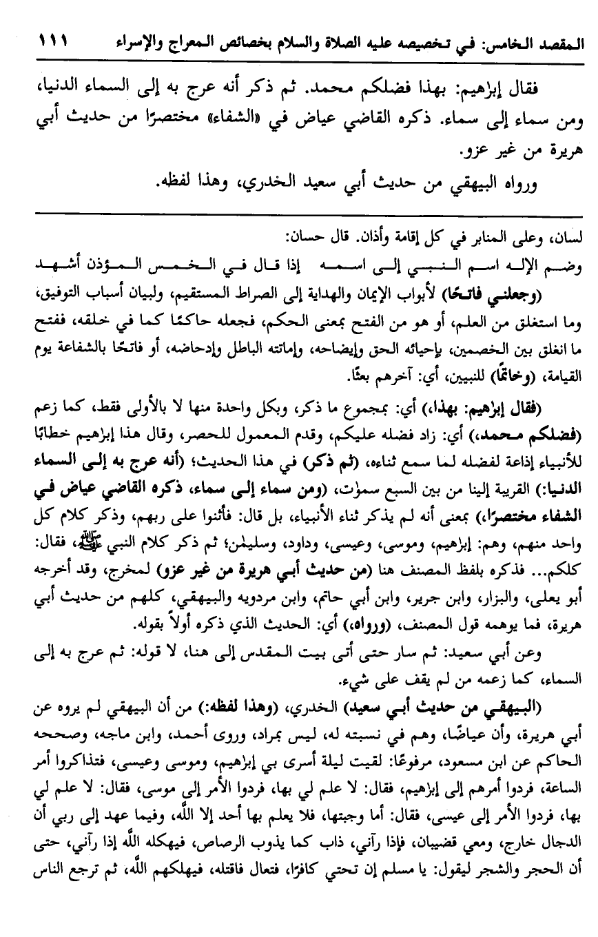 فقال إبراهيم: بهذا فضلكم محمد، ثم ذكر أنه عرج به إلى السماء الدنيا، ومن سماء إلى سماء، ذكره القاضي عياض في "الشفاء" مختصرًا من حديث أبي هريرة من غير عزو.