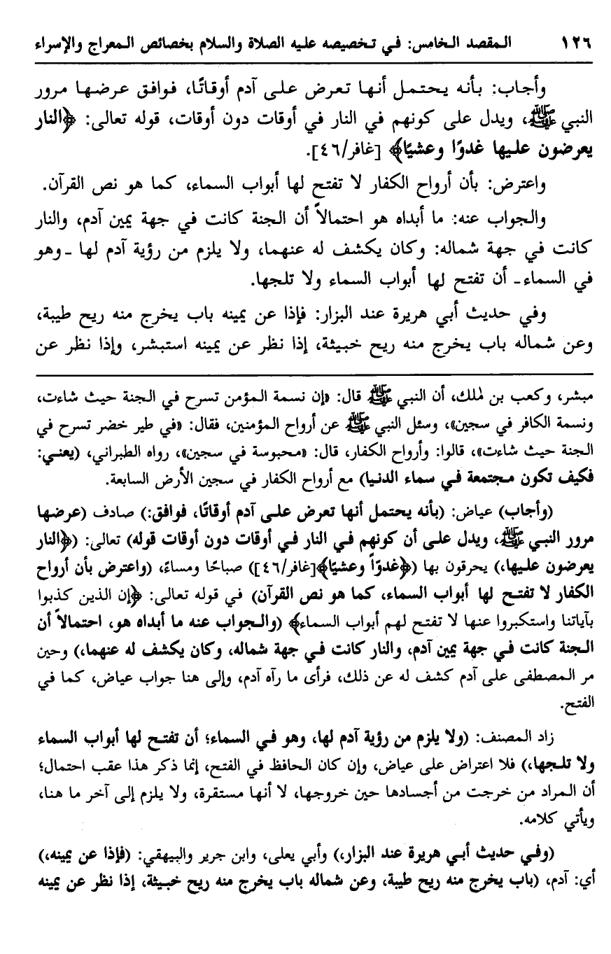 وأجاب: بأنه يحتمل أنها تعرض على آدم أوقاتًا، فوافق عرضها مرور النبي -صلى الله عليه وسلم- ويدل على كونهم في النار في أوقات دون أوقات، قوله تعالى: {النَّارُ يُعْرَضُونَ عَلَيْهَا غُدُوًّا وَعَشِيًّا} [غافر: 46] .