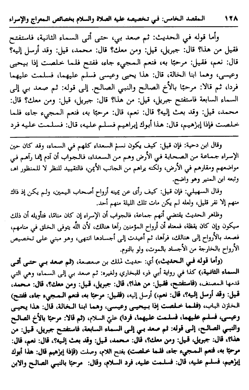 "وأما قوله في الحديث"، أي: حديث مالك بن صعصعة، "ثم صعد بي حتى أتى السماء الثانية"، كذا في رواية أبي ذر، للبخاري ولغيره: "ثم صعد بي إلى السماء"،وهي التي قدمه المصنف، "فاستفتح فقيل: من هذا؟، قال: جبريل، قيل: ومن معك؟، قال: محمد، قيل وقد أرسله إليه؟، قال: نعم"، أرسل إليه، "فقيل: مرحبًا بن، فنعم المجيء جاء، ففتح" الخازن الباب، "فلما خلصت إذا بيحيى وعيسى، وهما ابن الخالة، قال: هذا يحيى وعيسى، فسلم عليهما، فسلمت عليهما، فردا" علي السلام، "ثم قالا: مرحبًا بالأخ الصالح والنبي الصالح، إلى قوله: ثم صعد بي إلى السماء السابعة، فاستفتح جبريل، قيل: من هذا؟ قال: جبريل، قيل: ومن معك؟: قال: محمد، قيل: وقد بعث إليه؟، قال: نعم، قال: مرحبًا به، فنعم المجيء جاء فلما خلصت" "فتح اللام، وصلت "فإذا إبراهيم قال: هذا أبوك إبراهيم، فسلم عليه، قال: فسملت عليه، فرد السلام، وقال: مرحبًا بالنبي الصالح، والابن
