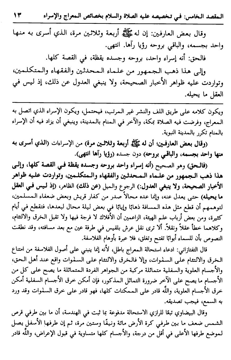 قال التفتازاني: ادعاء استحالة المعراج باطل؛ لأنه إنما ينبني على أصول الفلاسفة من امتناع الخرق والالتئام على السموات، وإلا فلخرق والالتئام على السموات واقع عند أهل الحق، والأجسام العلوية والسفلية متماثلة مركبة من الجواهر الفردة المتماثلة ما يصح على كل من الأجسام ما يصح على الآخر ضرورة التماثل المذكور، فإن أمكن خرق الأجسام السفلية أمكن خرق الأجسام العلوية، والله قادر على الممكنات كلها، فهو قادر على خرق السموات وقد ورد به السمع، فيجب تصديقه.