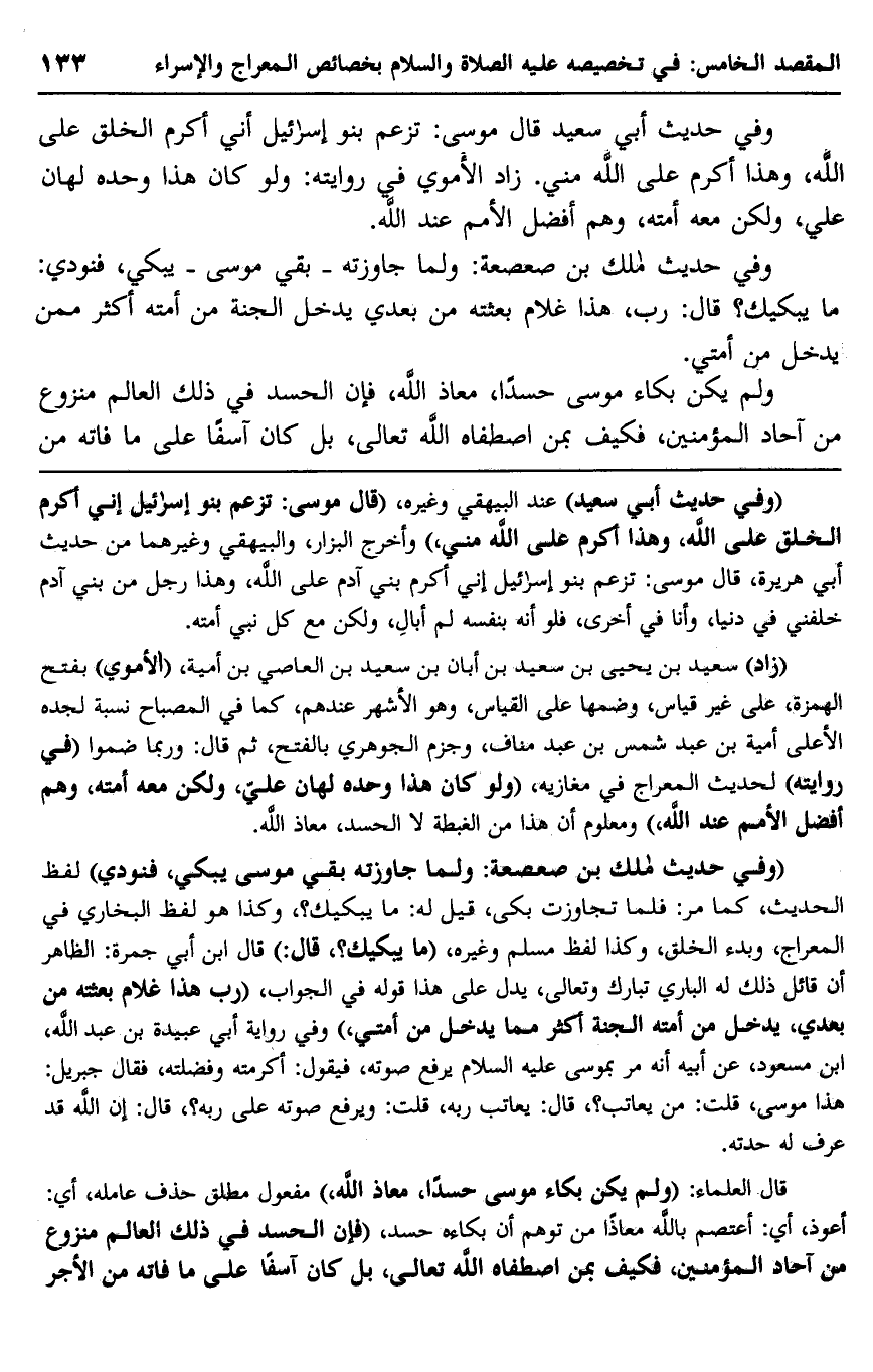 "زاد" سعيد بن يحيى بن سعيد بن أبان بن سعيد بن العاصي بن أمية، "الأموي" بفتح الهمزة، على غير قياس، وضمها على القياس وهو الأشهر عندهم، كما في المصباح نسبة لجده الأعلى أمية بن عبد شمس بن عبد مناف، وجزم الجوهري بالفتح، ثم قال: وربما ضموا "في روايته" لحديث المعراج في مغازيه، "ولو كان هذا وحده لهان علي، ولكن معه أمته، وهم أفضل الأمم عند الله"، ومعلوم أن هذا من الغبطة لا الحسد، معاذ الله.