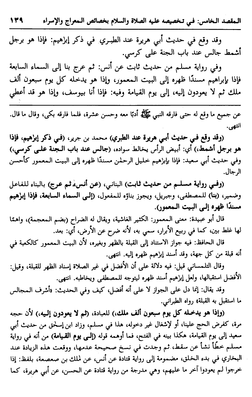 وفي رواية مسلم من حديث ثابت عن أنس: ثم عرج بنا إلى السماء السابعة فإذا بإبراهيم مسندًا ظهره إلى البيت المعمور، وإذ هو يدخله كل يوم سبعون ألف ملك ثم لا يعودون إليه، إلى يوم القيامة وفيه، فإذا أنا بيوسف، وإذا هو قد أعطي