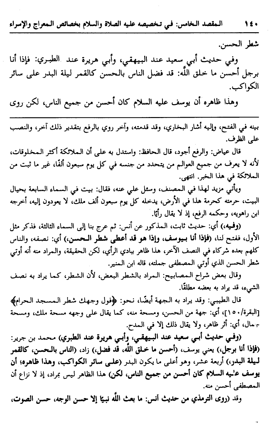 "وفي حديث أبي سعيد عند البيهقي، وأبي هريرة عند الطبري" محمد بن جرير: "فإذا أنا برجل"، يعني يوسف، "أحسن ما خلق الله، قد فضل"، زاد، "الناس بالحسن، كالقمر ليلة البدر"، أربعة عشر، وهو أعلى ما يكون البدر "على سائر الكواكب، وهذا ظاهره؛ أن يوسف عليه السلام، كان أحسن من جميع الناس، لكن" هذا الظاهر ليس بمراد، إذ لا نزاع أن المصطفى أحسن منه.