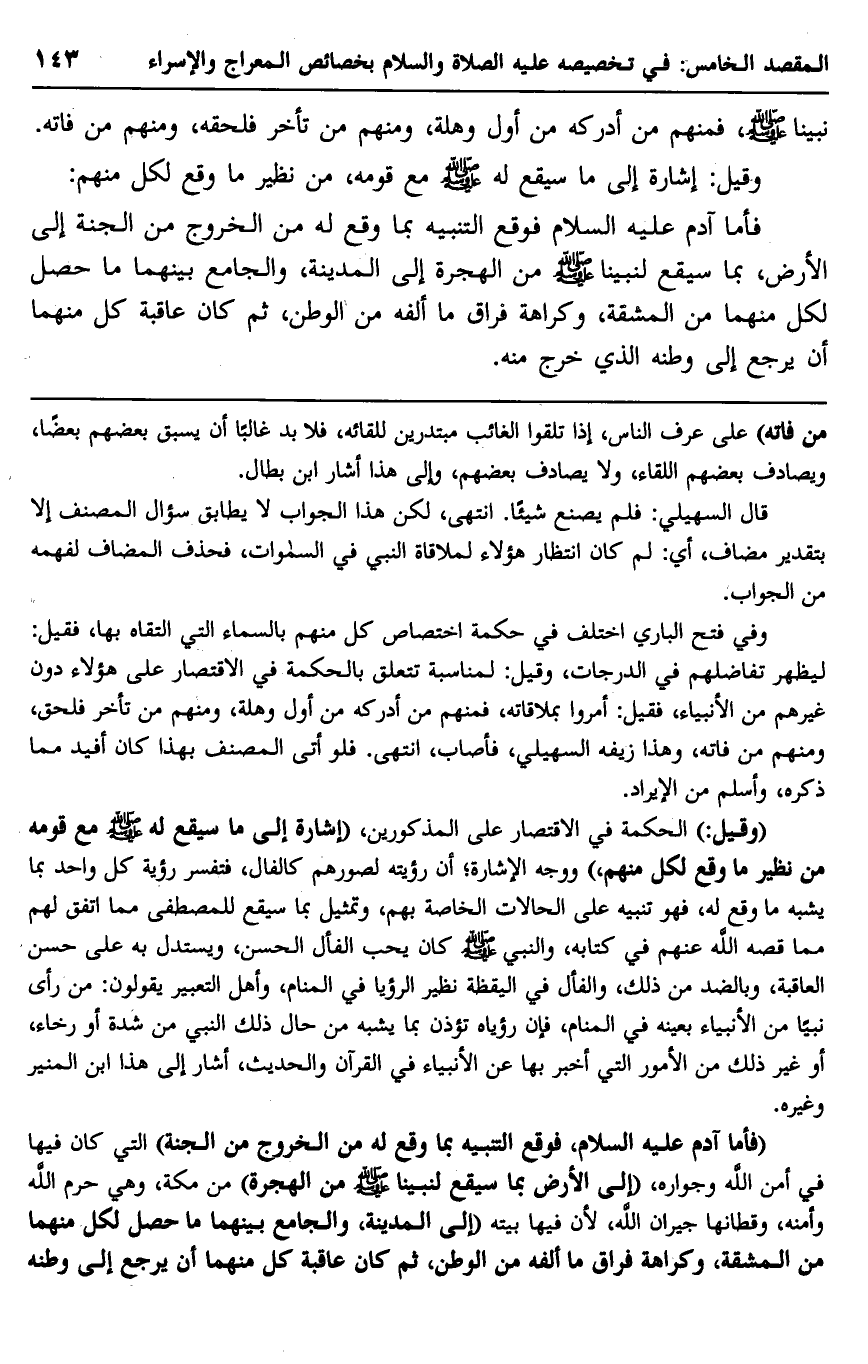 وفي فتح الباري اختلف في حكمة اختصاص كل منهم بالسماء التي التقاه بها، فقيل: ليظهر تفاضلهم في الدرجات، وقيل: لمناسبة تتعلق بالحكمة في الاقتصار على هؤلاء دون غيرهم من الأنبياء، فقيل: أمروا بملاقاته، فمنهم من أدركه من أول وهلة، ومنهم من تأخر فلحق، ومنهم من فاته، وهذا زيفه السهيلي، فأصاب، انتهى، فلو أتى المصنف بهذا كان أفيد مما ذكره، وأسلم من الإيراد.