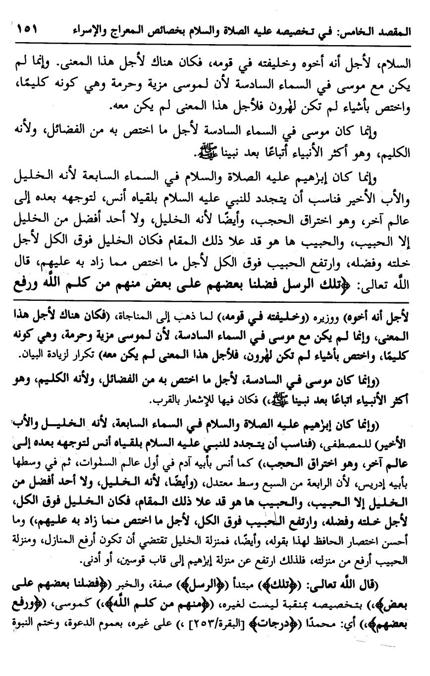 "قال الله تعالى: " {تِلْك} " مبتدأ " {الرُّسُل} " صفة، والخبر " {فَضَّلْنَا بَعْضَهُمْ عَلَى بَعْضٍ} " بتخصيصه بمنقبة ليست لغيره، " {مِنْهُمْ مَنْ كَلَّمَ اللَّه} " كموسى، " {وَرَفَعَ بَعْضَهُم} " أي: محمدًا " {دَرَجَات} " [البقرة: 253] "، على غيره بعموم الدعوة، وختم النبوة