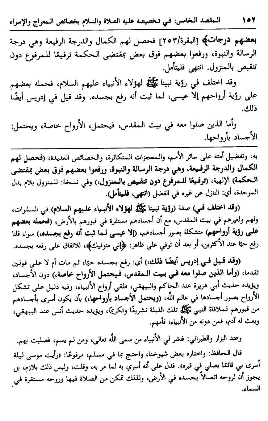 "وقد اختلف في" صفة "رؤية نبينا -صلى الله عليه وسلم- لهؤلاء الأنبياء عليهم السلام" في السماوات ولهم ولغيرهم في بيت المقدس، مع أن أجسادهم مستقرة في قبورهم بالأرض، "فحمله بعضهم على رؤية أرواحهم" متشكلة بصور أجسادهم، "إلا عيسى لما ثبت أنه رفع بجسده"، سواء قلنا رفع حيا عند الأكثرين، أو بعد أن توفي على ظاهر: {إِنِّي مُتَوَفِّيك} ، للاتفاق على رفعه بجسده.
