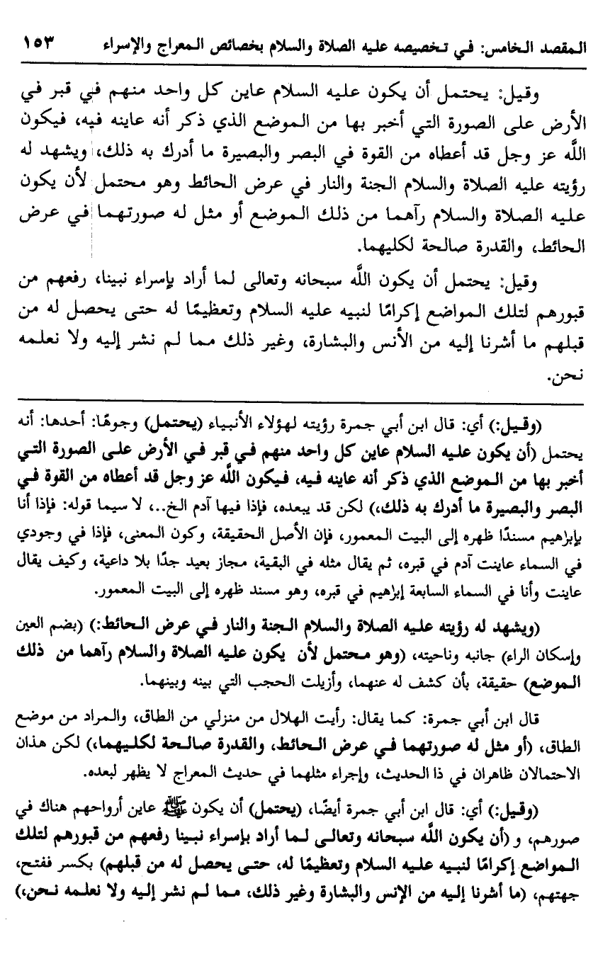 وقيل: يحتمل أن يكون الله سبحانه وتعالى لما أراد بإسراء نبينا، رفعهم من قبورهم لتلك المواضع إكرامًا لنبيه عليه السلام وتعظيمًا له حتى يحصل له من قبلهم ما أشرنا إليه من الأنس والبشارة وغير ذلك مما لم نشر إليه ولا نعلمه نحن.