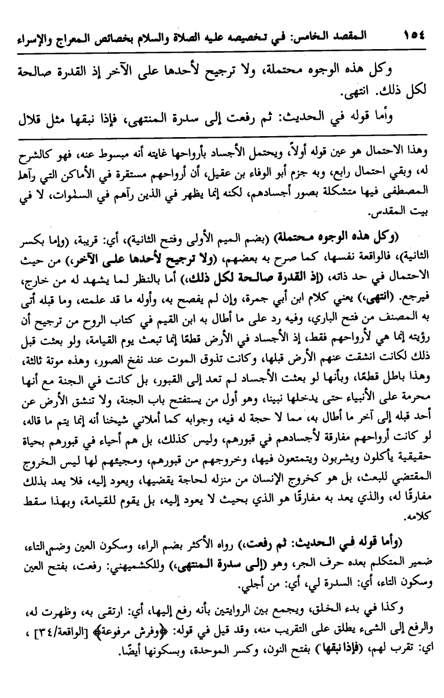 "وكل هذه الوجوه محتملة" "بضم الميم الأولى وفتح الثانية"، أي: قريبة، "وإما بكسر الثانية"، فالواقعة نفسها، كما صرح به بعضهم، "ولا ترجيح لأحدها على الآخر"، من حيث الاحتمال في حد ذاته، "إذ القدرة صالحة لكل ذلك"، أما بالنظر لما يشهد له من خارج، فيرجع. "انتهى"، يعني كلام ابن أبي جمرة، وإن لم يفصح به، وأوله ما قد علمته، وما قبله أتى به المصنف من فتح الباري، وفيه رد على ما أطال به ابن القيم في كتاب الروح من ترجيح أن رؤيته إنما هي لأرواحهم فقط، إذ الأجساد في الأرض قطعا إنما تبعث يوم القيامة، ولو بعثت قبل ذلك لكانت انشقت عنهم الأرض قبلها، وكانت تذوق الموت عند نفخ الصور، وهذه موتة ثالثة، وهذا باطل قطعًا، وبأنها لو بعثت الأجساد لم تعد إلى القبور، بل كانت في الجنة مع أنها محرمة على الأنبياء حتى يدخلها نبينا، وهو أول من يستفتح باب الجنة، ولا تنشق الأرض عن أحد قبله إلى آخر ما أطال به، مما لا حجة له فيه، وجوابه كما أملاني شيخنا أنه إنما يتم ما قاله، لو كانت أرواحهم مفارقة لأجسادهم في قبورهم، وليس كذلك، بل هم أحياء في قبورهم بحياة حقيقية يأكلون ويشربون ويتمتعون فيها، وخروجهم من قبورهم، ومجيئهم لها ليس الخروج المقتضي للبعث، بل هو كخروج الإنسان من منزله لحاجة يقضيها، ويعود إليه، فلا يعد بذلك مفارقًا له، والذي يعد به مفارقًا هو الذي بحيث لا يعود إليه، بل يقوم للقيامة، وبهذا سقط كلامه.