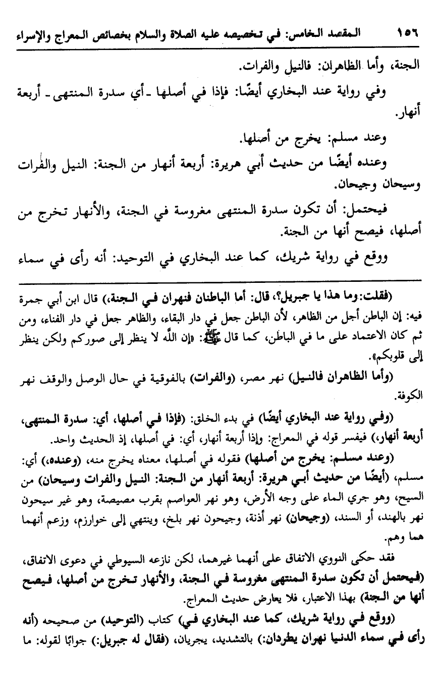 "فقلت: وما هذا يا جبريل؟، قال: أما الباطنان فنهران في الجنة"، قال ابن أبي جمرة فيه: إن الباطن أجل من الظاهر؛ لأن الباطن جعل في دار البقاء، والظاهر جعل في دار الفناء، ومن ثم كان الاعتماد على ما في الباطن، كما قال -صلى الله عليه وسلم: "إن الله لا ينظر إلى صوركم ولكن ينظر إلى قلوبكم".