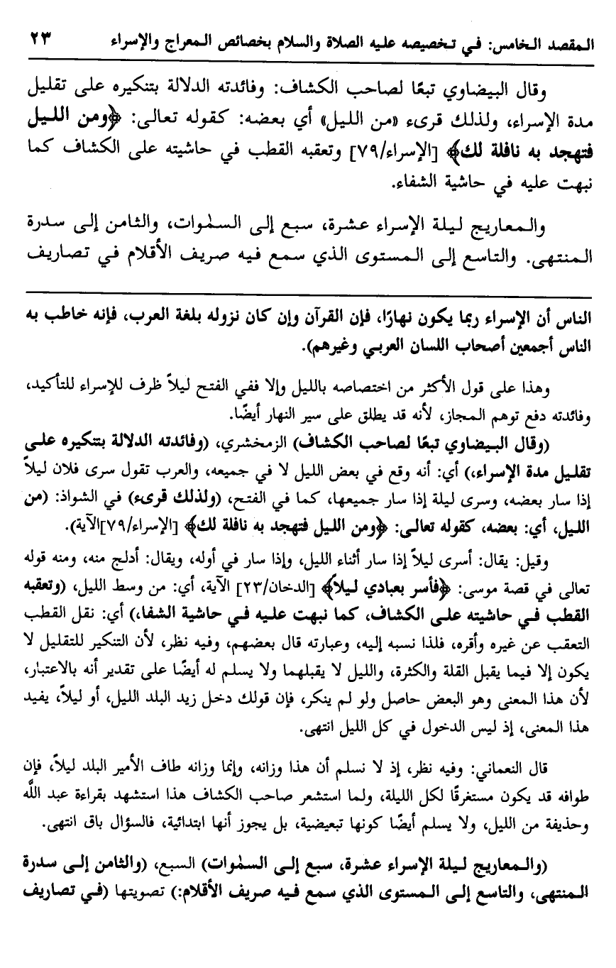 الناس أن الإسراء ربما يكون نهارًا، فإن القرآن وإن كان نزوله بلغة العرب، فإنه خاطب به الناس أجمعين أصحاب اللسان العربي وغيرهم".