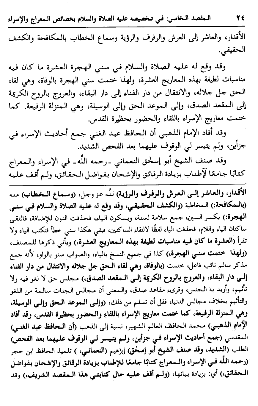 الأقدار، والعاشر إلى العرش والرفرف والرؤية" لله عز وجل، "وسمع الخطاب" منه "بالمكافحة": المخاطبة "والكشف الحقيقي، وقد وقع له عليه الصلاة والسلام في سني الهجرة": بكسر السين، جمع سلامة لسنة، وبسكون الياء، فحذفت النون للإضافة، فالتقى ساكنان الياء واللام، فحذفت الياء لفظًا لالتقاء الساكنين، فبقي هكذا سني خطأ فتكتب الياء ولا تقرأ "العشرة ما كان فيه مناسبات لطيفة بهذه المعاريج العشرة"، ويأتي ذكرها للمصنف، "ولهذا ختمت سني الهجرة"، كذا في جميع النسخ بالياء والصواب سنو بالواو؛ لأنه جمع مذكر سالم نائب فاعل، ختمت "بالوفاة، وهي لقاء الحق جل جلاله والانتقال من دار الفناء إلى دار البقاء، والعروج بالروح الكريمة إلى المقعد الصدق"، مجلس حق لا لغو فيه ولا تأثيم وأريد به الجنس، وقرئ مقاعد صدق، والمعنى أن مجالس الجنات سالمة من اللغو والتأثيم بخلال مجالس الدنيا، فقل أن تسلم من ذلك، "وإلى الموعد الحق وإلى الوسيلة، وهي المنزلة الرفيعة، كما ختمت معاريج الإسراء باللقاء والحضور بحظيرة القدس، وقد أفاد الإمام الذهبي" محمد الحافظ، العالم الشهير، نسبة إلى الذهب "أن الحافظ عبد الغني" المقدسي "جمع أحاديث الإسراء في جزأين، ولم يتيسر لي الوقوف عليهما بعد الفحص" الطلب "الشديد، وقد صنف الشيخ أبو إسحاق" إبراهيم "النعماني،" تلميذ الحافظ ابن حجر "رحمه الله في الإسراء والمعراج كتابًا جامعًا للإطناب بزيادة الرقائق والإشحان بفواضل الحقائق،" أي: بزيادة بيانها، "ولم أقف عليها حال كتابتي هذا المقصد الشريف"، وقد