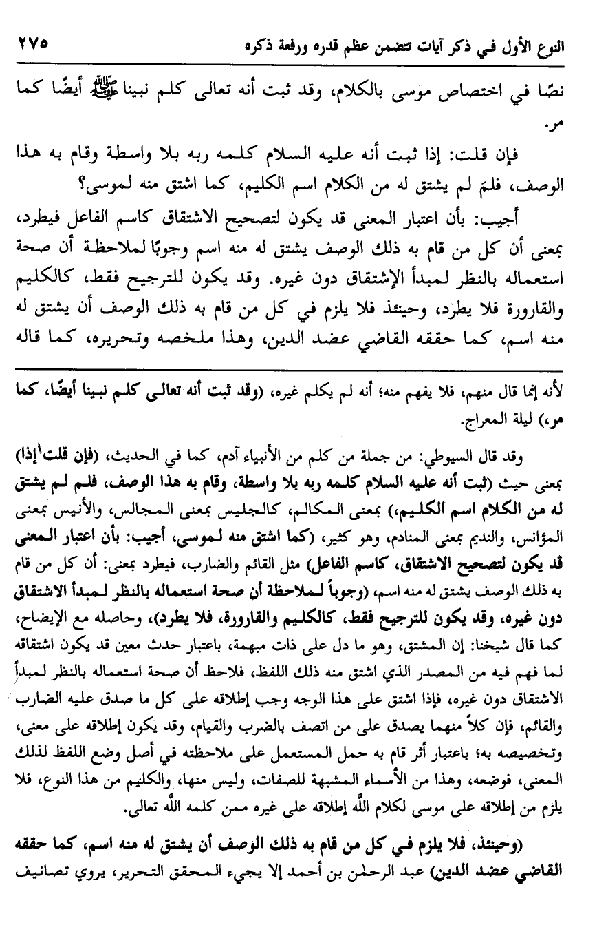 "وحينئذ، فلا يلزم في كل من قام به ذلك الوصف أن يشتق له منه اسم، كما حققه القاضي عضد الدين" عبد الرحمن بن أحمد إلا يجيء المحقق التحرير، يروي تصانيف