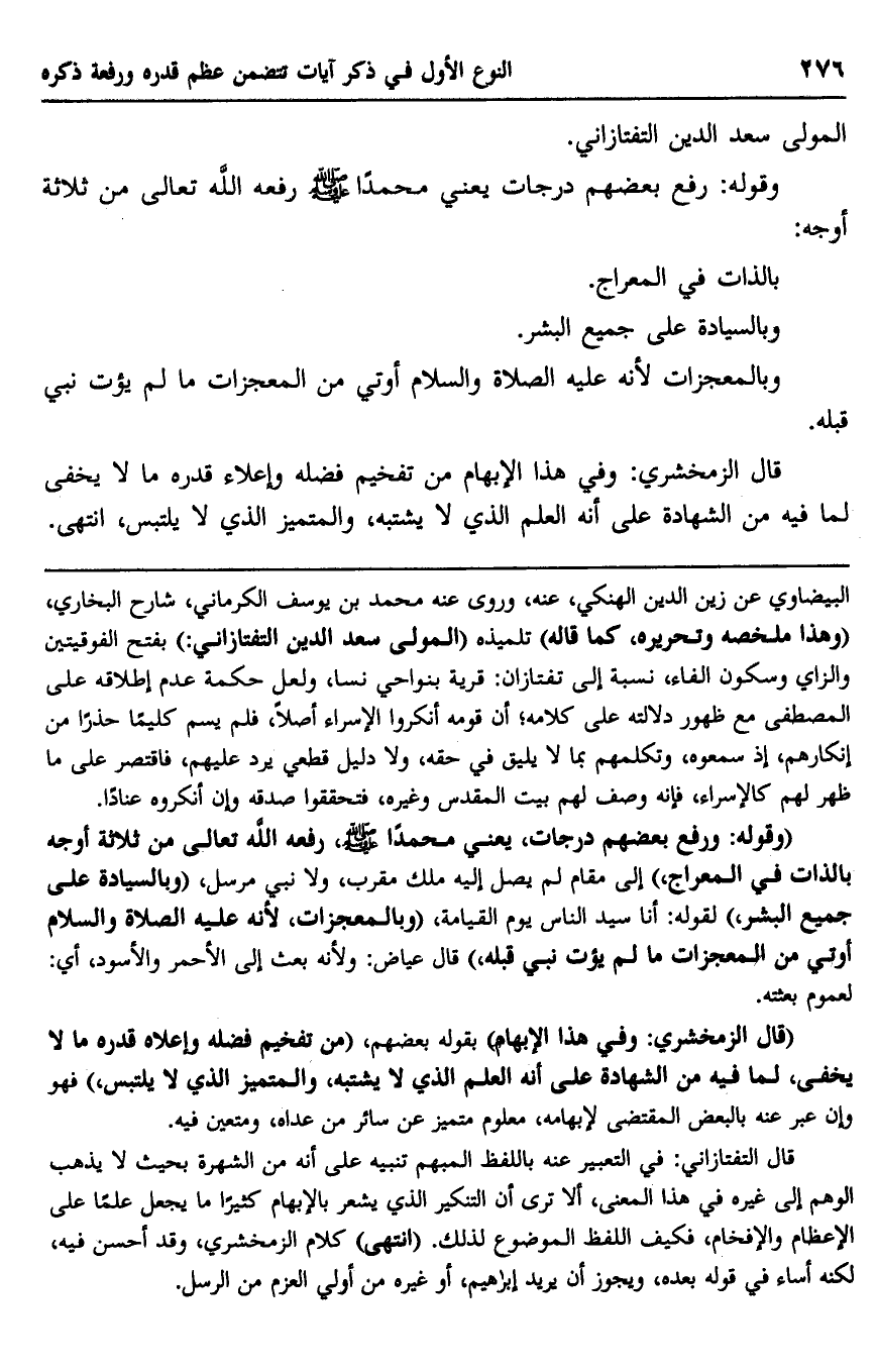 البيضاوي عن زين الدين الهنكي، عنه، وروى عنه محمد بن يوسف الكرماني، شارح البخاري، "وهذا ملخصه وتحريره، كما قاله" تلميذه "المولى سعد الدين التفتازاني" بفتح الفوقيتين والزاي وسكون الفاء، نسبة إلى تفتازان: قرية بنواحي نسا، ولعل حكمة عدم إطلاقه على المصطفى مع ظهور دلالته على كلامه؛ أن قومه أنكروا الإسراء أصلًا، فلم يسم كليمًا حذرًا من إنكارهم، إذ سمعوه، وتكلمهم بما لا يليق في حقه، ولا دليل قطعي يرد عليهم، فاقتصر على ما ظهر لهم كالإسراء، فإنه وصف لهم بيت المقدس وغيره، فتحققوا صدقه وإن أنكروه عنادًا.
