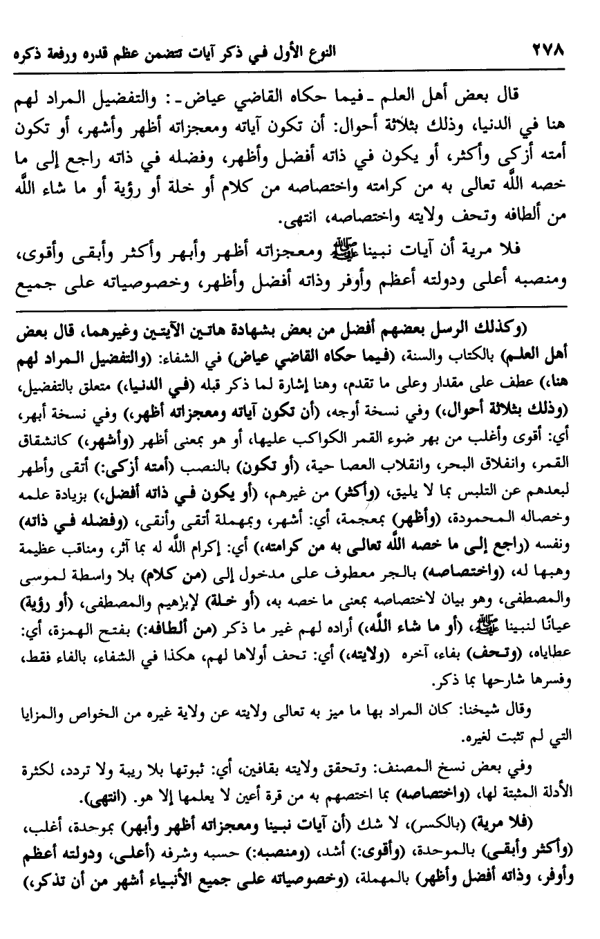 "وكذلك الرسل بعضهم أفضل من بعض بشهادة هاتين الآيتين وغيرهما، قال بعض أهل العلم" بالكتاب والسنة، "فيما حكاه القاضي عياض" في الشفاء: "والتفضيل المراد لهم هنا" عطف على مقدار وعلى ما تقدم، وهنا إشارة لما ذكر قبله "في الدنيا" متعلق بالتفضيل، "وذلك بثلاثة أحوال" وفي نسخة أوجه، "أن تكون آياته ومعجزاته أظهر" وفي نسخة أبهر، أي: أقوى، وأغلب من بهر ضوء القمر الكواكب عليها، أو هو بمعنى أظهر "وأشهر" كانشقاق القمر، وانفلاق البحر، وانقلاب العصا حية، "أو تكون" بالنصب "أمته أزكى" أتقى وأطهر لبعدهم عن التلبس بما لا يليق، "وأكثر" من غيرهم، "أو يكون في ذاته أفضل" بزيادة علمه وخصاله المحمودة، "وأظهر" بمعجمة، أي: أشهر، وبمهملة أتقى وأنقى، "وفضله في ذاته" ونفسه "راجع إلى ما خصه الله تعالى به من كرامته" أي: إكرام الله له بما آثر، ومناقب عظيمة وهبها له، "واختصاصه" بالجر معطوف على مدخول إلى "من كلام" بلا واسطة لموسى والمصطفى، وهو بيان لاختصاصه بمعنى ما خصه به، "أو خلة" لإبراهيم والمصطفى، "أو رؤية" عيانًا لنبينا صلى الله عليه وسلم، "أو ما شاء الله" أراده لهم غير ما ذكر "من ألطافه" بفتح الهمزة، أي: عطاياه، "وتحف" بفاء، آخره "ولايته" أي: تحف أولاها لهم، هكذا في الشفاء، بالفاء فقط، وفسرها شارحها بما ذكر.