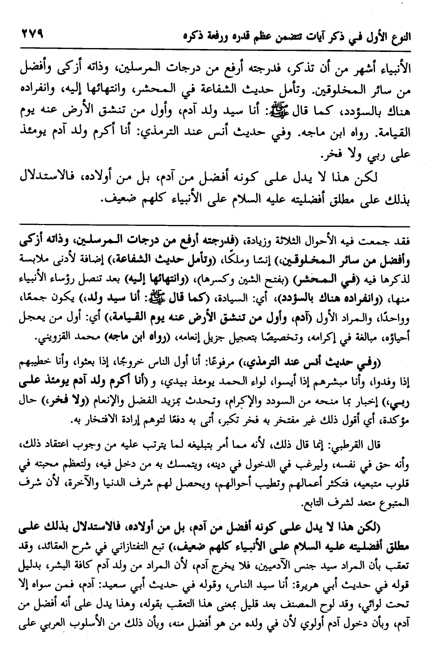 "لكن هذا لا يدل على كونه أفضل من آدم، بل من أولاده، فالاستدلال بذلك على مطلق أفضليته عليه السلام على الأنبياء كلهم ضعيف" تبع التفتازاني في شرح العقائد، وقد تعقب بأن المراد سيد جنس الآدميين، فلا يخرج آدم؛ لأن المراد من ولد آدم كافة البشر، بدليل قوله في حديث أبي هريرة: "أنا سيد الناس"، وقوله في حديث أبي سعيد: آدم، فمن سواه إلا تحت لوائي، وقد لوح المصنف بعد قليل بمعنى هذا التعقب بقوله، وهذا يدل على أنه أفضل من آدم، وبأن دخول آدم أولوي؛ لأن في ولده من هو أفضل منه، وبأن ذلك من الأسلوب العربي على