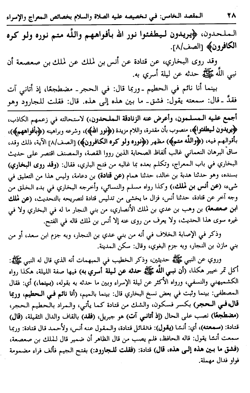 أجمع عليه المسلمون، وأعرض عنه الزنادقة الملحدون،" لاستحالته في زعمهم الكاذب، {يُرِيدُونَ لِيُطْفِئُوا} منصوب بأن مقدرة، واللام مزيدة {نُورَ اللَّهِ} "، وشرعه وبراهينه " {بِأَفْوَاهِهِمْ} "، بأقوالهم فيه، " {وَاللَّهُ مُتِمُّ} " مظهر " {نُورِهِ وَلَوْ كَرَِ الْكَافِرُونَ} " [الصف: 8] الآية، ذلك وقد، ساق البرهان النعماني غالب ألفاظ الصحابة الذين رووا القصة، والمصنف اقتصر على حديث البخاري في باب المعراج، وتكلم بعده بما غالبه في فتح الباري، فقال: "وقد روى البخاري" بسنده، وهو حدثنا هدبة بن خالد، حدثنا همام "عن قتادة" بن دعامة، وليس هذا من التعليق في شيء، "عن أنس بن مالك،" وكذا رواه مسلم والنسائي، وأخرجه البخاري في بدء الخلق من وجه آخر عن قتادة، حدثنا أنس، فزال ما يخشى من تدليس قتاده لتصريحه بالتحديث، "عن مالك بن صعصعة" بن وهب بن عدي بن مالك الأنصاري، من بني النجار ما له في البخاري ولا في غيره سوى هذا الحديث، ولا يعرف من روى عنه إلا أنس قاله في الفتح.