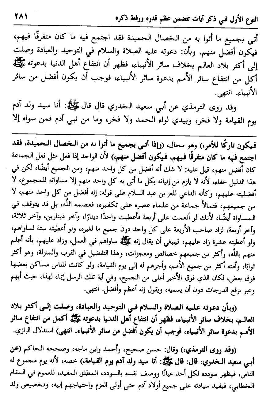 "وبأن دعوته عليه الصلاة والسلام في التوحيد والعبادة، وصلت إلى أكثر بلاد العالم، بخلاف سائر الأنبياء، فظهر أن انتفاع أهل الدنيا بدعوته صلى الله عليه وسلم أكمل من انتفاع سائر الأمم بدعوة سائر الأنبياء، فوجب أن يكون أفضل من سائر الأنبياء. انتهى" استدلال الرازي.