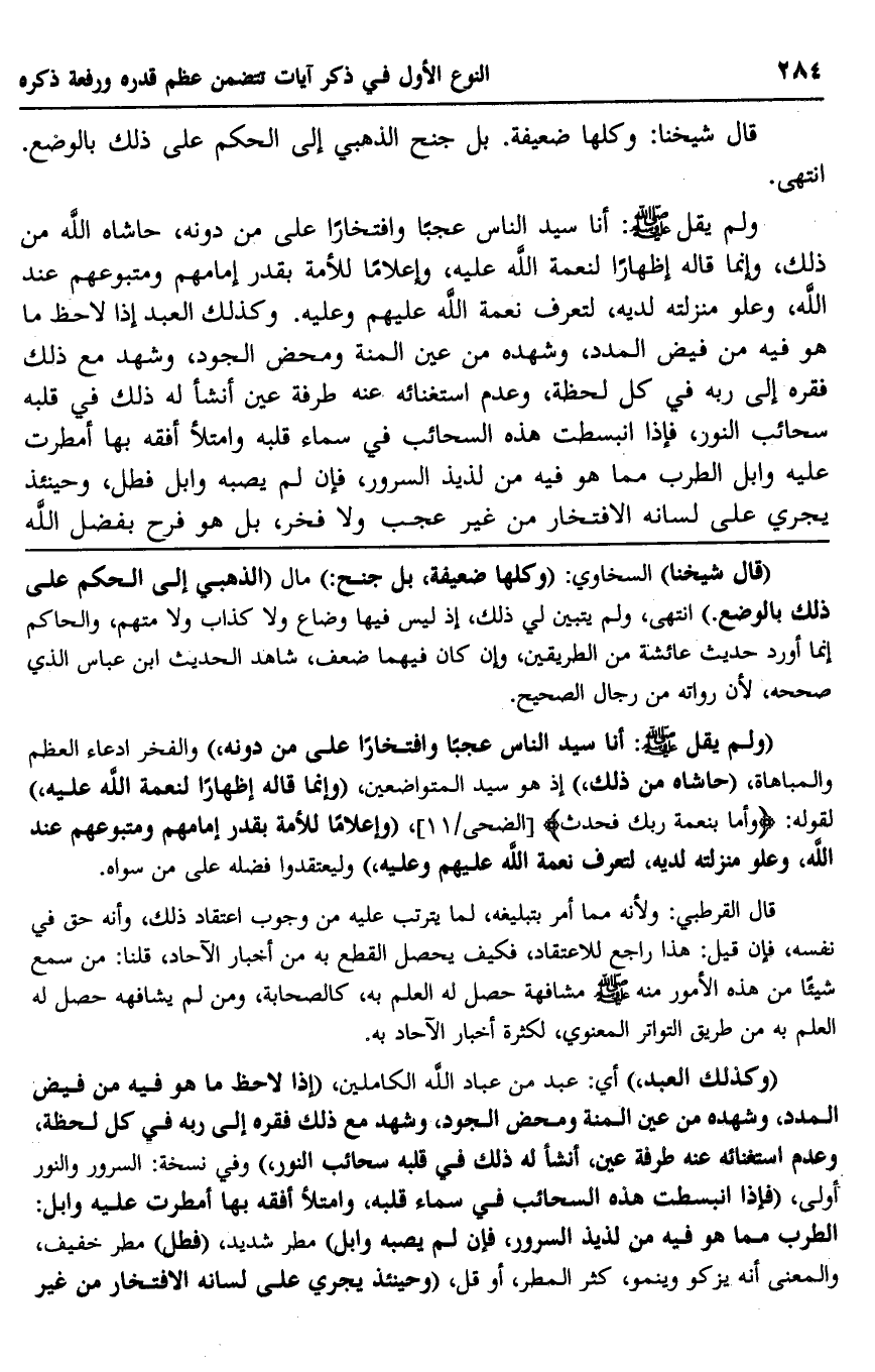ولم يقل صلى الله عليه وسلم: "أنا سيد الناس" عجبًا وافتخارًا على من دونه، حاشاه الله من ذلك، وإنما قاله إظهارًا لنعمة الله عليه، وإعلامًا للأمة بقدر إمامهم ومتبوعهم عند الله، وعلو منزلته لديه، لتعرف نعمة الله عليهم وعليه، وكذلك العبد إذا لاحظ ما هو فيه من فيض المدد، وشهده من عين المنة ومحض الجود، وشهد مع ذلك فقره إلى ربه في كل لحظة، وعدم استغنائه عنه طرفة عين أنشأ له ذلك في قلبه سحائب النور، فإذا انبسطت هذه السحائب في سماء قلبه، وامتلأ أفقه بها أمطرت عليه وابل الطرب مما هو فيه من لذيذ السرور، فإن لم يصبه وابل فطل، وحينئذ يجري على لسانه الافتخار من غير عجب ولا فخر، بل هو فرح بفضل الله