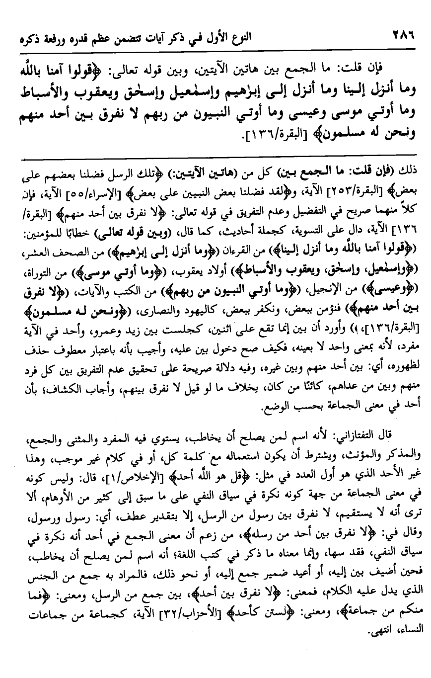 قال التفتازاني: لأنه اسم لمن يصلح أن يخاطب، يستوي فيه المفرد والمثنى والجمع، والمذكر والمؤنث، ويشترط أن يكون استعماله مع كلمة كل، أو في كلام غير موجب، وهذا غير الأحد اللذي هو أول العدد في مثل: {قُلْ هُوَ اللَّه} [الإخلاص: 1] ، قال: وليس كونه في معنى الجماعة من جهة كونه نكرة في سياق النفي على ما سبق إلى كثير من الأوهام، ألا ترى أنه لا يستقيم، لا نفرق بين رسول من الرسل، إلا بتقدير عطف، أي: رسول ورسول، وقال في: {لَا نُفَرِّقُ بَيْنَ أَحَدٍ مِنْ رُسُلِه} ، من زعم أن معنى الجمع في أحد أنه نكرة في سياق النفي، فقد سها، وإنما معناه ما ذكر في كتب اللغة؛ أنه اسم لمن يصلح أن يخاطب، فحين أضيف بين إليه، أو أعيد ضمير جميع إليه، أو نحو ذلك، فالمراد به جمع من الجنس الذي يدل عليه الكلام، فمعنى: {لَا نُفَرِّقُ بَيْنَ أَحَدٍ} ، بين جمع من الرسل، ومعنى، "فما منكم من جماعة"، ومعنى: {لَسْتُنَّ كَأَحَد} [الأحزاب: 32] الآية، كجماعة من جماعات النساء، انتهى.