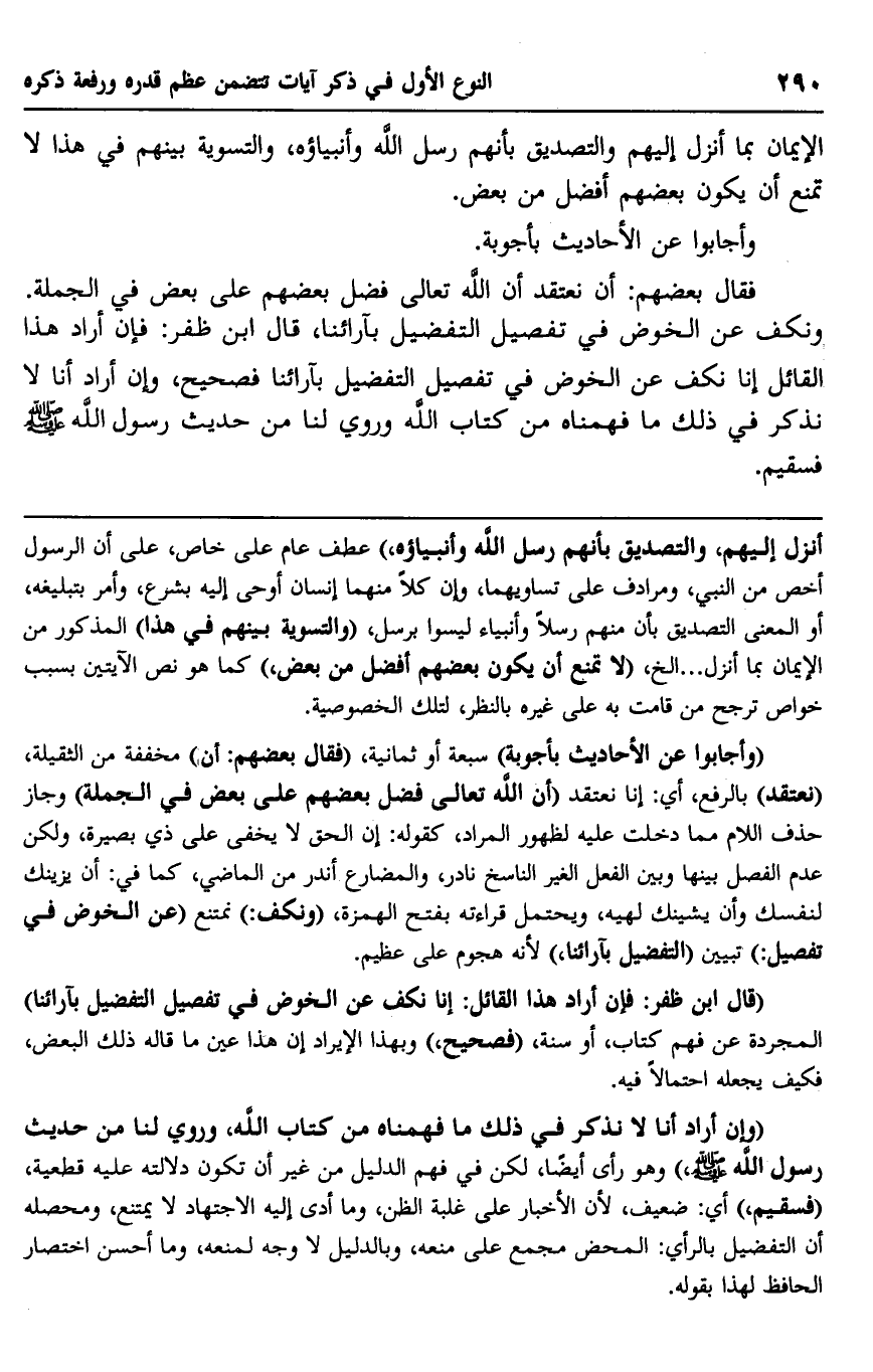 فقال بعضهم: أن نعتقد أن الله تعالى فضل بعضهم على بعض في الجملة، ونكف عن الخوض في تفصيل التفضيل بآرائنا، قال ابن ظفر: فإن أراد هذا القائل: إنا نكف عن الخوض في تفصيل التفضيل بآرائنا فصحيح، وإن أراد أنا لا نذكر في ذلك ما فهمناه من كتاب الله وروي لنا من حديث رسول الله صلى الله عليه وسلم فسقيم.