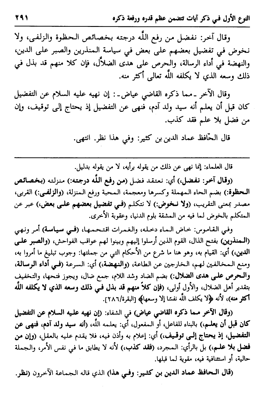 وقال آخر: نفضل من رفع الله درجته بخصائص الحظوة والزلفى، ولا نخوض في تفضيل بعضهم على بعض في سياسة المنذرين والصبر على الدين، والنهضة في أداء الرسالة، والحرص على هدى الضلال، فإن كلا منهم قد بذل في ذلك وسعه الذي لا يكلفه الله تعالى أكثر منه.