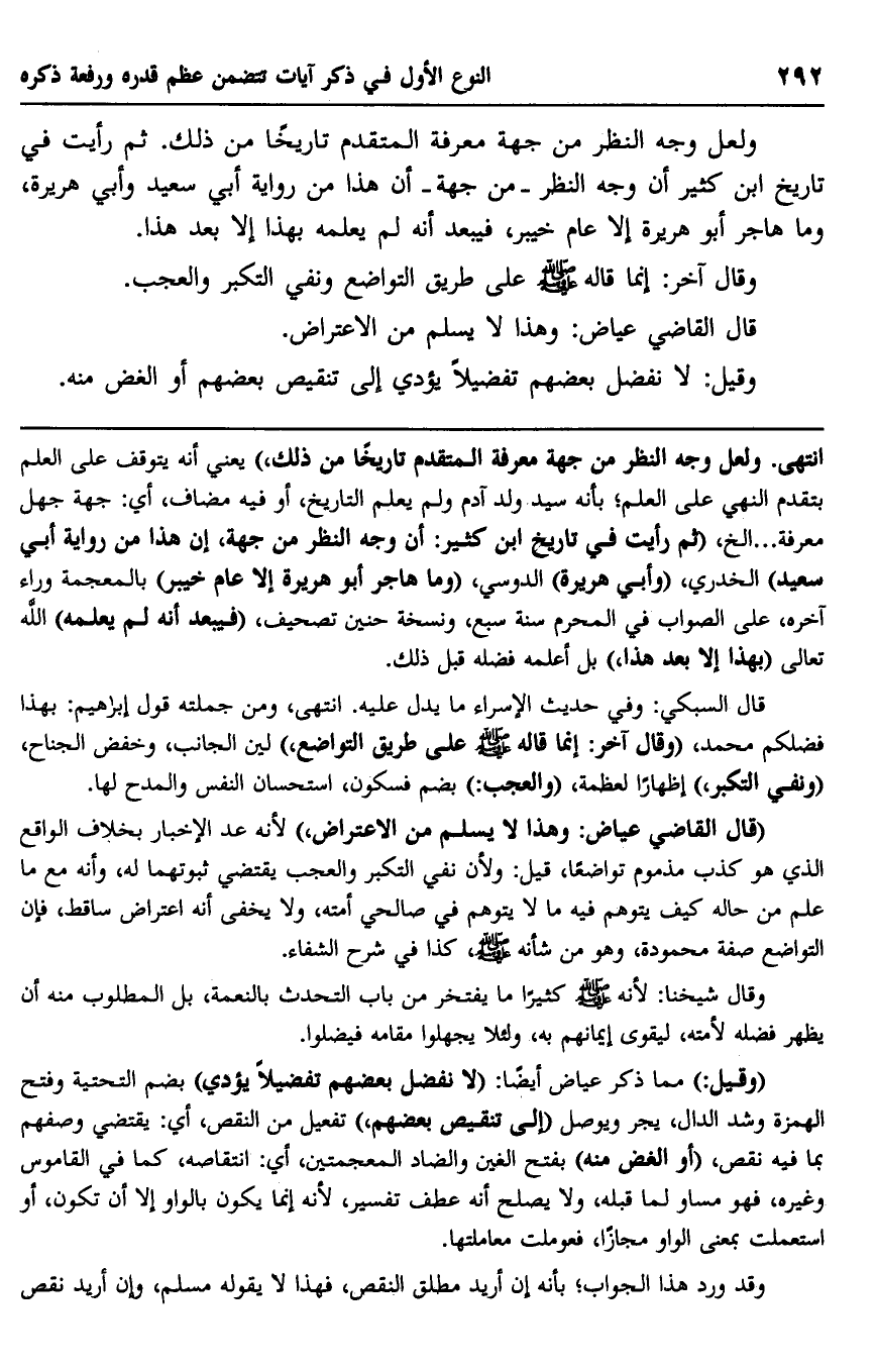 "وقيل": مما ذكر عياض أيضًا: "لا نفضل بعضهم تفضيلًا يؤدي" بضم التحتية وفتح الهمزة وشد الدال، يجر ويوصل "إلى تنقيص بعضهم" تفعيل من النقص، أي: يقتضي وصفهم بما فيه نقص، "أو الغض منه" بفتح الغين والضاد المعجمتين، أي: انتقاصه، كما في القاموس وغيره، فهو مساو لما قبله، ولا يصلح أنه عطف تفسير؛ لأنه إنما يكون بالواو إلا أن تكون، أو استعملت بمعنى الواو مجازًا، فعوملت معاملتها.