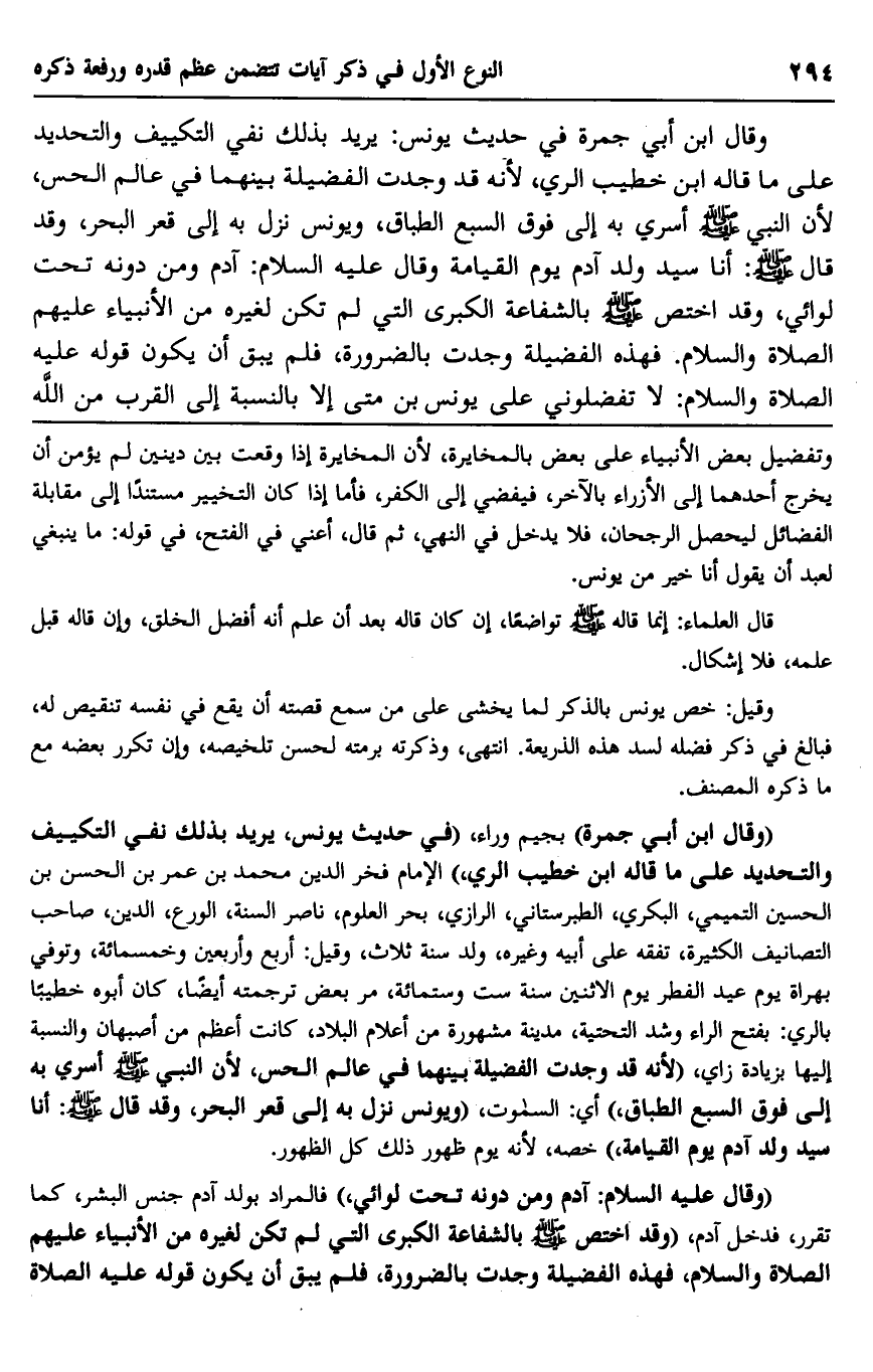 "وقال ابن أبي جمرة" بجيم وراء، "في حديث يونس، يريد بذلك نفي التكييف والتحديد على ما قاله ابن خطي الري" الإمام فخر الدين محمد بن عمر بن الحسن بن الحسين التميمي، البكري، الطبرستاني، الرازي، بحر العلوم، ناصر السنة، الورع، الدين، صاحب التصانيف الكثيرة، تفقه على أبيه وغيره، ولد سنة ثلاث، وقيل: أربع وأربعين وخمسمائة، وتوفي بهراة يوم عيد الفطر يوم الاثنين سنة ست وستمائة، مر بعض ترجمته أيضًا، كان أبوه خطيبًا بالري: بفتح الراء وشد التحتية، مدينة مشهورة من أعلام البلاد، كانت أعظم من أصبهان والنسبة إليها بزيادة زاي؛ "لأنه قد وجدت الفضيلة بينهما في عالم الحس؛ لأن النبي صلى الله عليه وسلم أسري به إلى فوق السبع الطباق" أي السماوات "ويونس نزل به إلى قعر البحر، وقد قال صلى الله عليه وسلم: "أنا سيد ولد آدم يوم القيامة" خصه؛ لأنه يوم ظهور ذلك كل الظهور.
