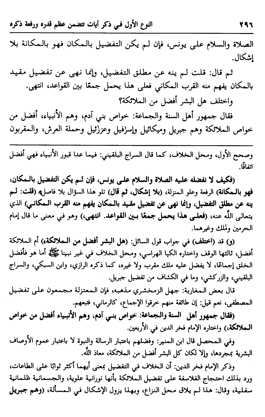 "فقال جمهور أهل السنة والجماعة: خواص بني آدم، وهم الأنبياء أفضل من خواص الملائكة" واختاره الإمام فخر الدين في الأربعين.