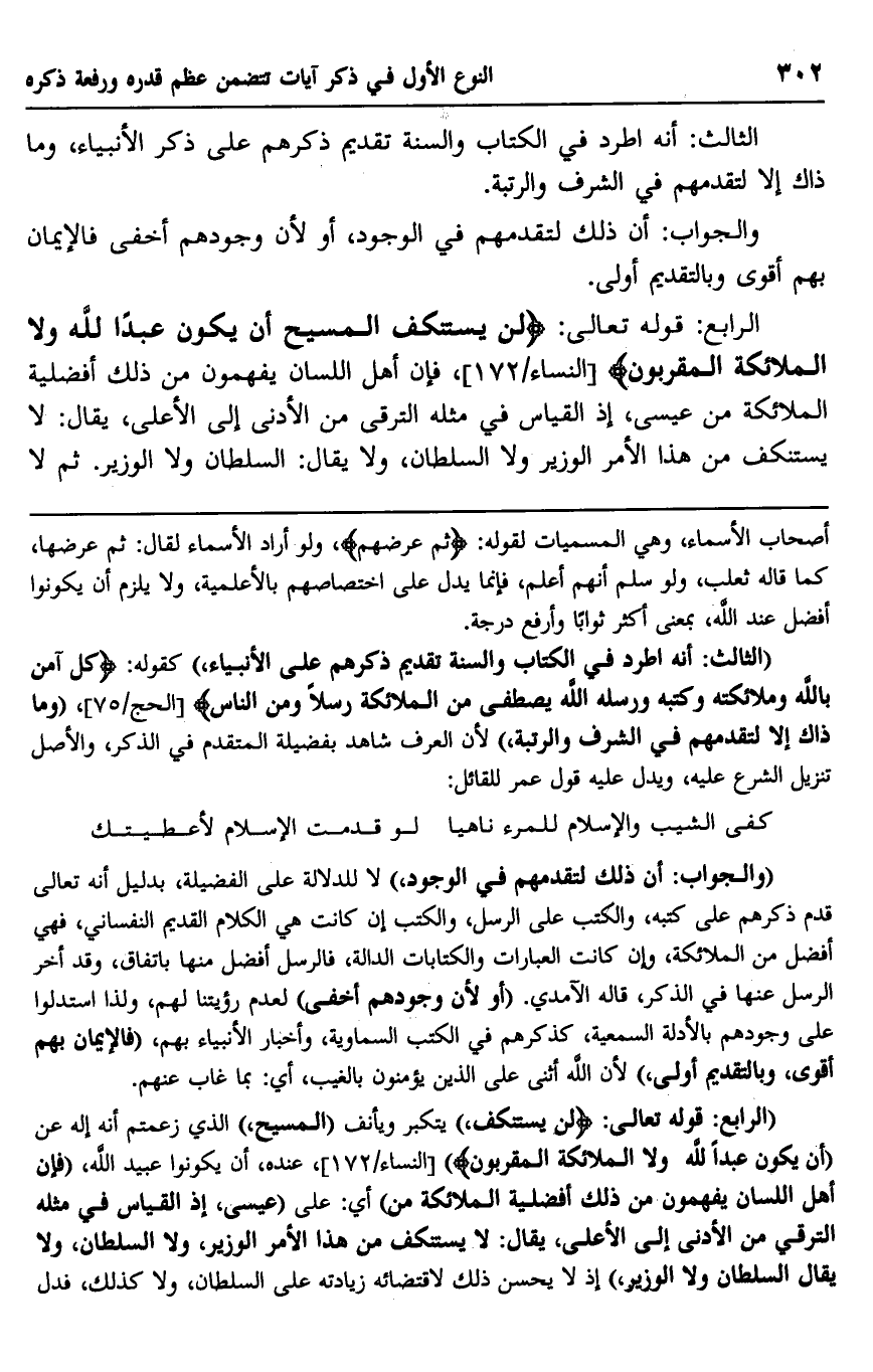 "الرابع: قوله تعالى: {لَنْ يَسْتَنْكِف} يتكبر ويأنف {الْمَسِيحُ} الذي زعمتم أنه إله عن {أَنْ يَكُونَ عَبْدًا لِلَّهِ وَلَا الْمَلَائِكَةُ الْمُقَرَّبُونَ} [النساء: 172] ، عنده، أن يكونوا عبيد الله، "فإن أهل اللسان يفهمون من ذلك أفضلية الملائكة من" أي: على "عيسى، إذ القياس في مثله الترقي من الأدنى إلى الأعلى، يقال: لا يستنكف من هذا الأمر الوزير، ولا السلطان، ولا يقال: السلطان ولا الوزير" إذ لا يحسن ذلك لاقتضائه زيادته على السلطان، ولا كذلك، فدل